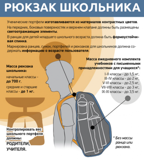максимальный вес вместе с учебниками: до 1,5 кг в 1-2 классах, до 2 кг — в 3-4, до 2,5 кг — в 5-6, до 3,5 кг — в 7-8, до 4 кг — в 9-11;