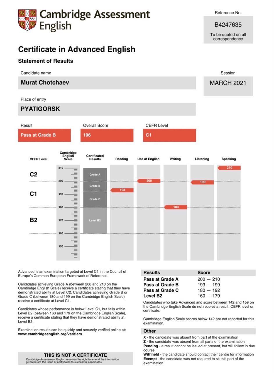 Я преподаватель с уровнем C1-C2 (уровень "носитель", по результатам кембриджского экзамена CAE) и углубленным опытом как частного преподавания так и обучения студентов языковых и IT ВУЗов. Я преподаю на базе моего собственного курса, успешно опробованного на сотне моих студентов.
