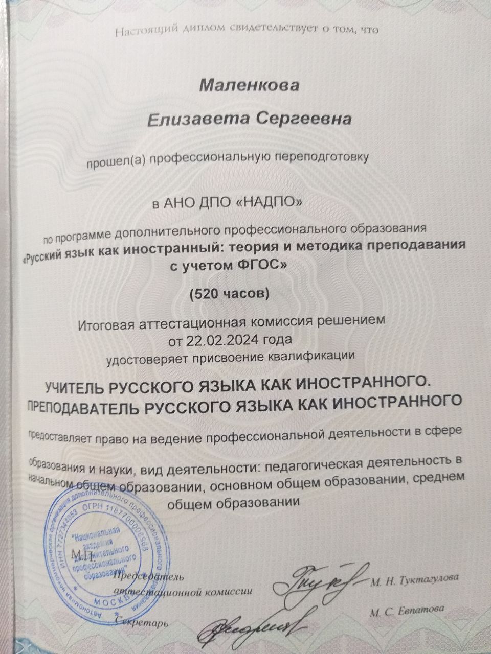 Меня зовут Маленкова Елизавета Сергеевна. Я - дипломированный преподаватель русского языка как иностранного, а также носитель. Окончила Национальную Академию Дополнительного Профессионального Образования по специальности: преподаватель русского как иностранного. Стаж преподавания: 2 года. Категория учащихся: студенты, взрослые. Уровни подготовки: начальный, средний, продвинутый. Благодаря моей авторской методике вы сможете легко и быстро выучить русский язык, как свой родной.