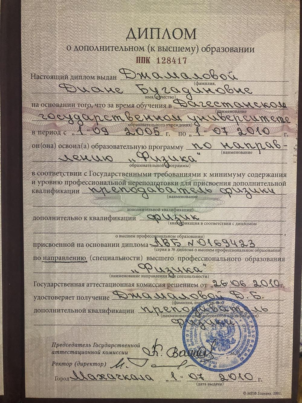 Если Вы боитесь и не знаете сможете ли сдать экзамен… Не знаете как подготовиться к ОГЭ или ЕГЭ… Если Вы родитель и хотите чтобы ваш ребенок сдал экзамен успешно… Если Вы хотите, чтобы ваш ребенок не нервничал и спокойно готовился к экзамену… То тогда давайте знакомиться. Меня зовут Джамалова Диана и я профессиональный репетитор. Я работаю только репетитором и трачу свое время на подготовку интересных занятий, чтобы дети готовились к экзамену не мучительно, а с интересом. Чтобы знания оставались и после сдачи экзаменов ! За более чем 10 лет своей работы в школах и репетиторских центрах, а сейчас и онлайн, я успешно подготовила: более 100 учеников к ЕГЭ на 85+ баллов более 80 учеников к ОГЭ на 4-5 более 100 учеников улучшили свою успеваемость Расскажу немного о себе. Я преподаю и готовлю к экзаменам по трем предметам (математике,информатике) благодаря своей суперпамяти и суперлогическим способностям. Также я знаю два иностранных языка (английский, турецкий) Каждый год я сдаю ЕГЭ На моих занятиях вы получите: Авторскую методику Интересные уроки- к каждому уроку есть презентация Методические материалы Доступ к записанным урокам Коннект -быстро налаживаю контакт с учениками Отчет раз в месяц Формат занятий (дистанционный): Групповой, индивидуальный 2-3 занятия в неделю Использую онлайн -доску Ученик решает задания на онлайн-доске ? Работаю на платформе ЗУМ без перерывов 55мин
