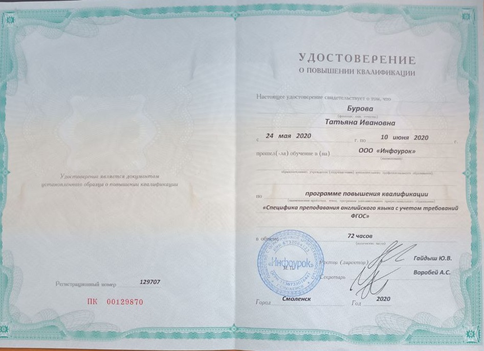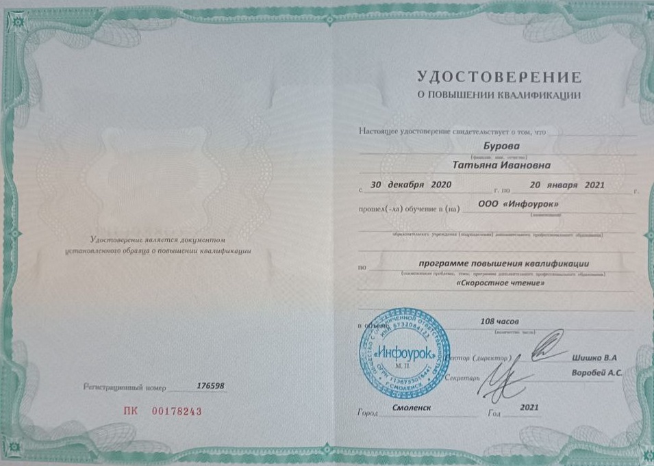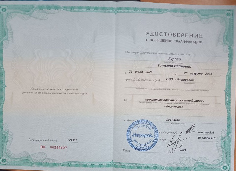 Подготовка к школе с Татьяной Ивановной! С гордостью подготовила десятки детей к успешному обучению в школе! Набираю группы и провожу индивидуальные занятия для детей 6-7 лет. - Чтение за месяц - Правильное написание и красивый почерк - Умственное счёт с переходом через десяток - Развивающие упражнения для памяти и мышления Бесплатный урок-диагностика для определения уровня знаний вашего ребенка! Запись и вопросы по телефону. С нетерпением жду ваших сообщений! С уважением, Татьяна Ивановна. КАЛЛИГРАФИЯ С ЭЛЕМЕНТАМИ СКОРОЧТЕНИЯ + РАЗВИТИЕ. Каллиграфия и скорочтение с Татьяной Ивановной! Здравствуйте, уважаемые родители и дорогие дети! Набираю группы для занятий по каллиграфии и скорочтению, а также упражнениям для развития памяти, речи и логического мышления. Достижения: - Дети улучшили результаты по всем предметам. - Быстро и осознанно готовят домашние задания! Программа занятий: - Каллиграфия для красивого почерка - Скорочтение для быстрого восприятия информации - Упражнения для развития памяти, речи и логического мышления Бесплатный урок-диагностика! На занятии определим уровень знаний вашего ребенка и наметим индивидуальную программу обучения. Дата занятия согласуется индивидуально. Если у вас есть вопросы или хотите записаться, свяжитесь со мной! С уважением, Татьяна Ивановна. АНГЛИЙСКИЙ ДЛЯ НАЧИНАЮЩИХ Изучение английского языка с Татьяной Ивановной! Уважаемые родители и дорогие дети! Набираю группу для начинающих — детей от 6 лет и взрослых! Достижения: - Дети сдали итоговые экзамены на 5 по английскому. - Взрослые успешно прошли международный экзамен при переселении в США. Программа: - Углубленное понимание английского языка - Закрепление материала на тренажерах и в рабочих тетрадях - Учебные материалы в электронном виде (учебник, слова, тетради) Формат занятий: Онлайн на платформе Zoom. Бесплатный урок-диагностика! На занятии определим уровень владения языком и наметим программу обучения. Дата занятия согласуется индивидуально. Если у вас есть вопросы или хотите записаться, свяжитесь со мной!