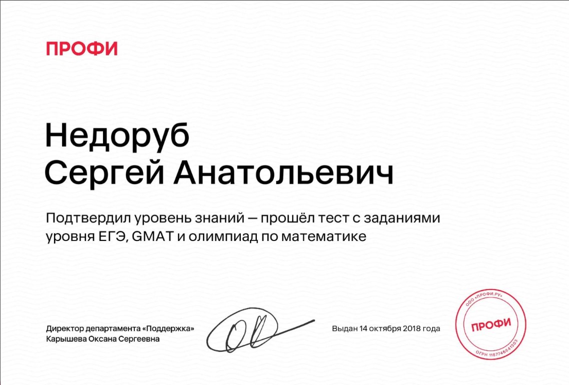 Ребенок будет сдавать ЕГЭ по профильной математике в этом году. Начали заниматься с Сергеем Анатольевичем, нам всё нравится. Педагог сильный, очень хорошо всё объясняет. Рекомендует 100%