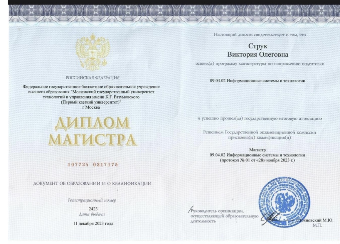 Выпускница МГУту им к г Разумовского, по направлению : информационные систему и технологии