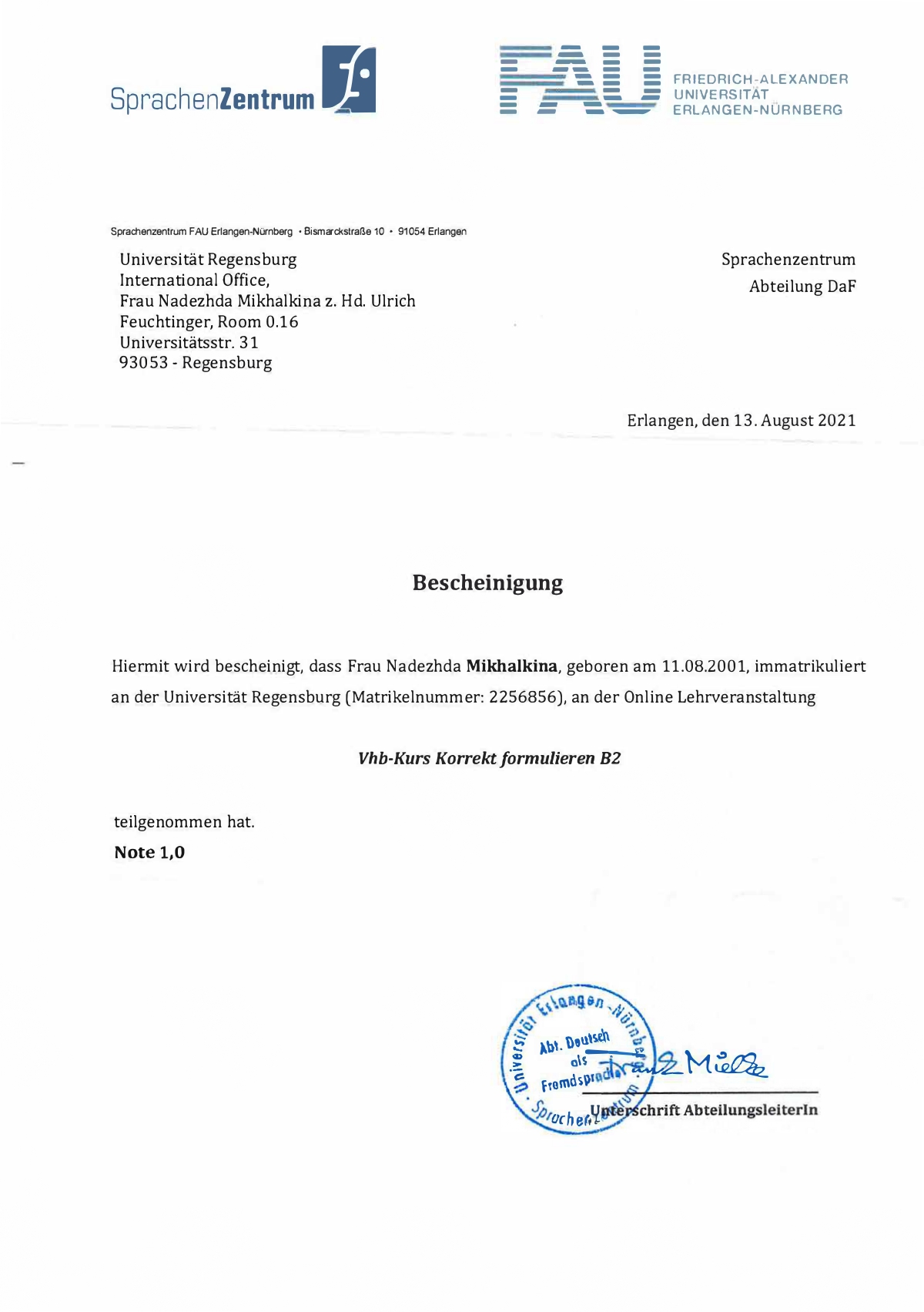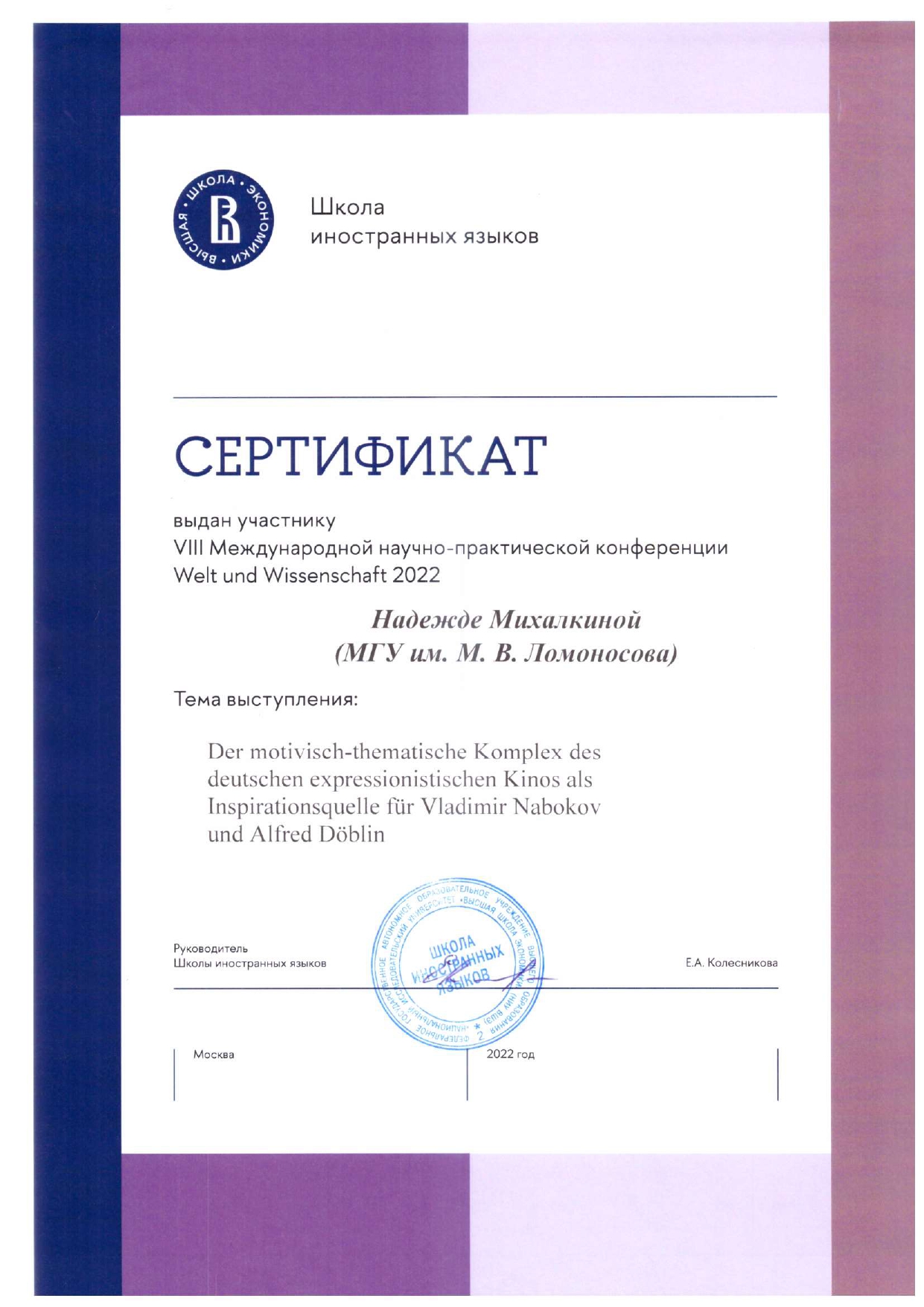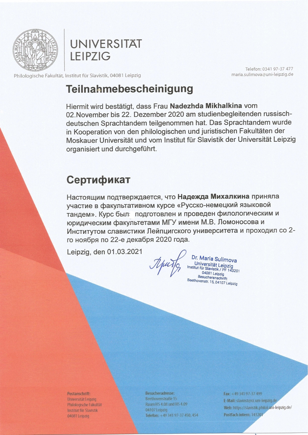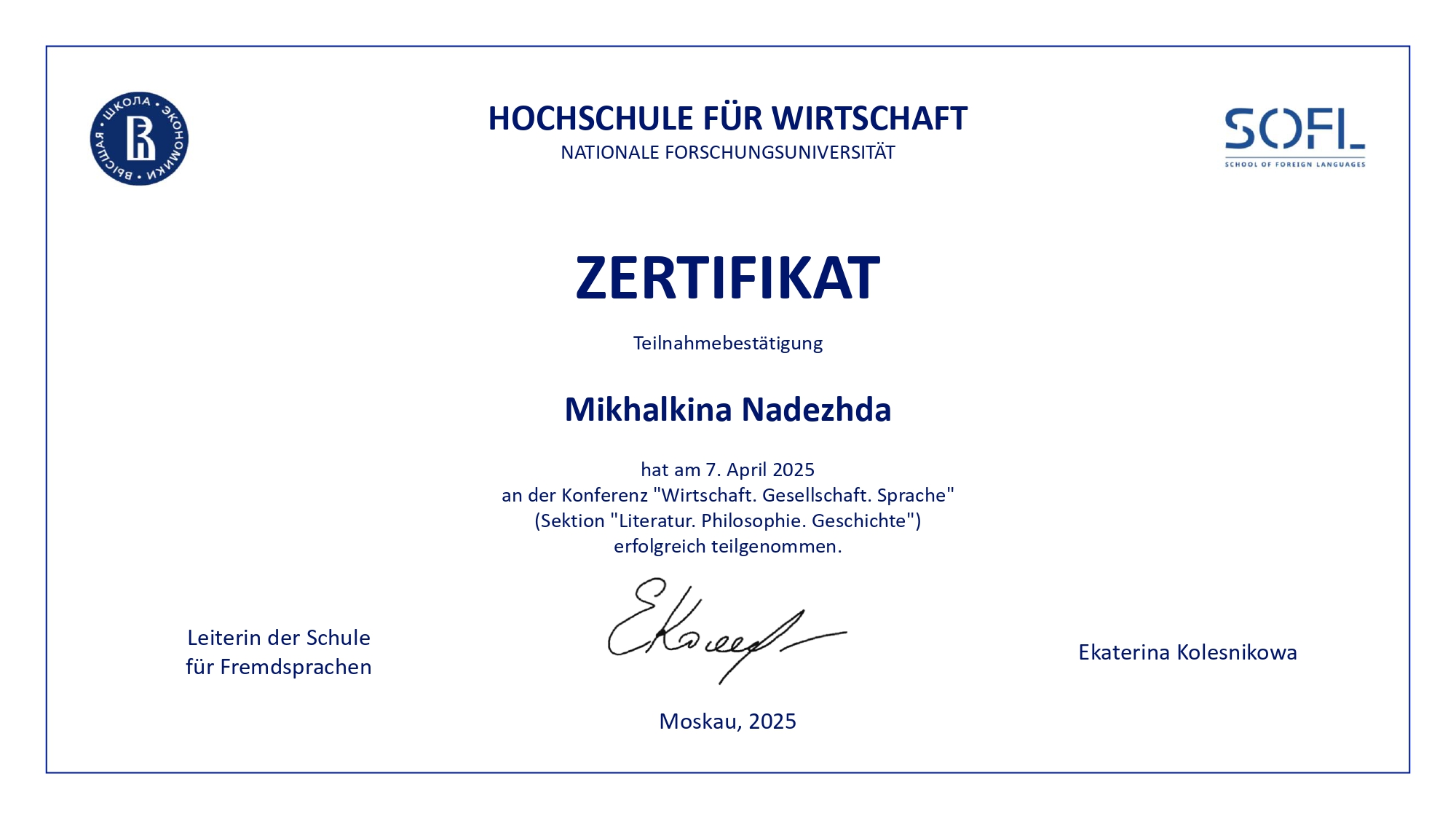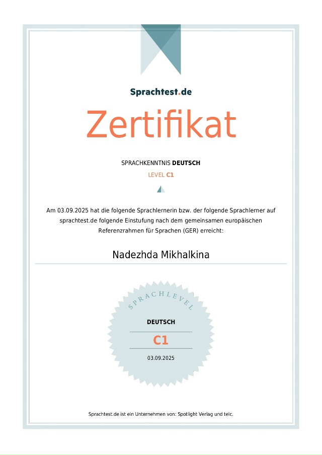 Меня зовут Надежда, и я – младший научный сотрудник ИМЛИ РАН, литературный редактор, преподаватель русского и немецкого языков с 4-летним опытом подготовки учеников к международным экзаменам (Goethe-Zertifikat, ÖSD), ОГЭ и ЕГЭ, устному собеседованию и итоговому сочинению. Обо мне: ✅ в 2024 г. окончила с отличием магистратуру филологического факультета МГУ им. М.В. Ломоносова по специальности «Теоретико-прикладное литературоведение и критика» (в 2022 г. – бакалавриат филологического факультета МГУ им. М.В. Ломоносова по профилю «Русский язык и литература»); ✅ проходила полугодовую стажировку в Регенсбургском университете по направлению «Немецкая филология» (Universität Regensburg, Fakultät für Sprach-, Literatur- und Kulturwissenschaften, Deutsche Philologie, 2021 г.); ✅ участвовала в программе русско-немецкого языкового тандема совместно с Рурским университетом Бохума (Ruhr-Universität Bochum, 2019 г., две недели) и с Лейпцигским университетом (Universität Leipzig, 2020 г., два месяца); ✅ выступила на 10+ международных научных конференциях и опубликовала более 5 статей и рецензий на русском и немецком языках (на темы, связанные с литературой и кинематографом Германии, русской прозой XX столетия); ✅ в 2018 г. сдала ЕГЭ по русскому языку на 98 баллов. Опыт работы: ✅ с 2021 г. провожу авторские курсы в Школе юного филолога им. Л.М. Баш при филологическом факультете МГУ им. М.В. Ломоносова («Ключевые тексты немецкой литературы», «Опыты медленного чтения», «Литература – театр – кино: точки пересечения»); ✅ с 2024 г. работаю преподавателем русского языка в проекте поддержки старшеклассников «Ключи» (онлайн-занятия по подготовке к ЕГЭ), а также педагогом по искусству в летних образовательных лагерях для подростков (компания «Маткласс»). Работаю с мотивированными, нацеленными на результат людьми. План занятий, учебные материалы и д/з составляю, учитывая Ваши индивидуальные особенности и оставшееся до дня Х время.