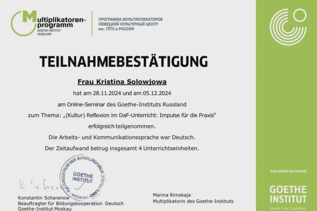 Меня зовут Кристина и вот пару фактов обо мне, как об учителе: ✔ Преподаю немецкий язык как иностранный с 2016 года. ✔ Обучила более 50 учеников, многие из которых успешно сдали международные экзамены, GOETHE, TELC. ✔ Имею три уровня квалификации: бакалавр, магистр и преподаватель-исследователь (аспирантура) по специальности германские языки, немецкий язык. ✔ Обучалась в немецкой языковой школе (Carl Duisberg Centren) в городе Мюнхен, которая является одним из ведущих образовательных заведений в области изучения немецкого языка. ✔ Являюсь автором более двадцати научных работ, в том числе учебного пособия по вариантам немецкого языка в Австрии, Швейцарии и Лихтенштейне. Что я предлагаю Вам как ученику: 📓 Индивидуальный план урока, исходя из Ваших целей. 📓 Современные учебники немецких издательств, которые я Вам предоставляю бесплатно в онлайн формате. 📓 Удобный онлайн словарь, в который я вношу лексику после каждого нашего с Вами урока. 📓 Мои личные конспекты по грамматике, то есть после каждой грамматической темы у Вас остается этот материал в удобном конспекте. 📓 Практически круглосуточная поддержка в чате по любым вопросам, которые касаются немецкого языка и своевременная проверка домашних заданий. На уроке мы не тратим время на проверку домашнего задания. 📓 Подготовка к экзаменам TELC, GOETHE. 📓 Регулярно слушаем, смотрим, пишем и читаем на немецком языке. 📓 Уже с начального уровня активно читаем художественную литературу. 📓 Могу также помочь Вашим детям со школьной программой Германии или Австрии. Мои уроки Вам подойдут, если Вы до сих пор: 1. Не понимаете зачем нужен Genitiv в немецком языке. 2. Как запомнить все эти склонения прилагательных, существительных и не смотреть каждый раз в таблицу, чтобы выбрать правильный вариант. 3. Задаетесь вопросом, что такое N-Deklination и зачем он нужен? 4. Не можете понять почему в одном предложении с предлогом in артикль das: ich gehe in das Kino, а во втором уже dem: ich bin in dem Kino? 5. Боитесь оплатить большую сумму за экзамен и не сдать его, ведь часть с говорением такая сложная и неясно, что вообще надо сказать, а главное успеть раскрыть свою мысль за 3 минуты.