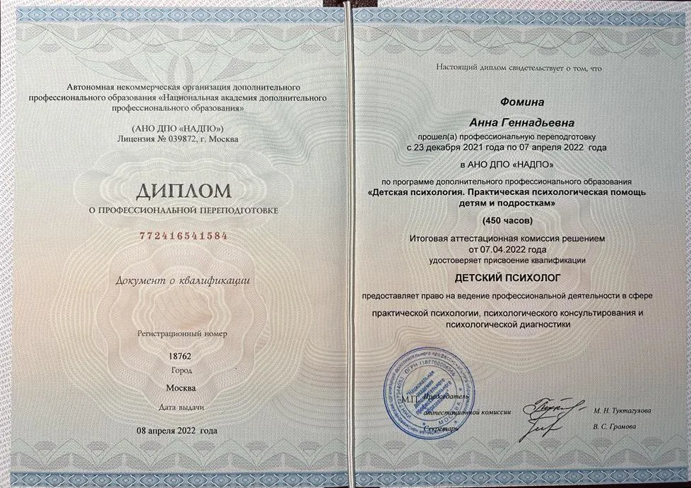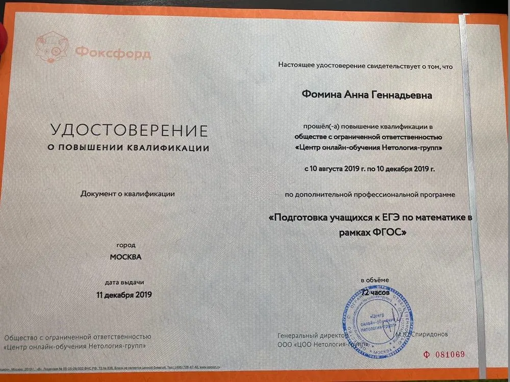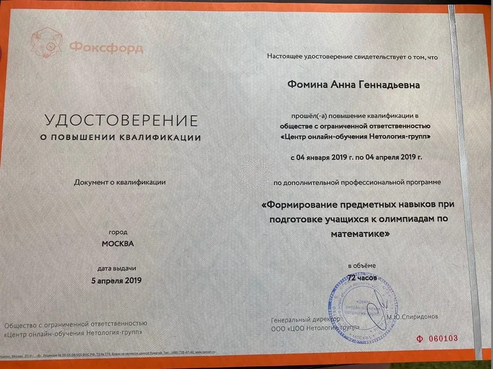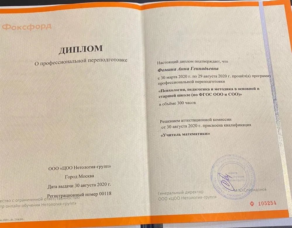 В 2019 году закончила Московский Авиационный Институт, факультет «Авиационная техника», проектирование самолетов. Работала репетитором с первого курса и считаю педагогику своим призванием. В дополнение к математическому образованию, прошла программы профессиональной переподготовки и курсы: «Психология, педагогика и методика преподавания в основной и старшей школе», квалификация «Учитель математики». Повышение квалификации по подготовке к ЕГЭ и ОГЭ Подготовка к олимпиадам Ментальная арифметика и др. Детская психология. Практическая психологическая помощь детям и подросткам" Я строю занятия исходя из потребностей ученика. Уделяю внимание основной задаче и эмоциональному состоянию. Считаю, что обучение и подготовка к экзаменам должна включать в себя не только знания по программе, а так же правильную мотивацию, эмоциональное спокойствие ученика. Зачастую переживания сильно влияют на результат. Объясняю материал на языке ребенка, исходя из его интересов и хобби. Уделяю внимание разностороннему развитию. Математика царица наук, но она теснено связана и с другими науками, поэтому необходимо объяснить ребенку для чего ему нужно познавать мир во всех плоскостях и показать взаимосвязи. Для меня важно, чтобы ученик чувствовал себя спокойно и комфортно для лучшего усвоения материала. За двойкой может скрываться что-то большее, чем просто плохо усвоенный материал: неуверенность, недопонимание, волнение.Помогаю детям развить чувство дисциплины. Благодаря такой атмосфере на моих занятиях даже ученики со слабой базой с легкостью занимаются по профильной программе, за счет осознанного решения задач. Добиваюсь полного понимания материала. Изучение математики со мной будет легкой и интересной. Провожу занятия в различных форматах: Индивидуальные Групповые Групповые занятия имеют множество плюсов. У учеников есть возможность обмениваться опытом, учиться на своих и чужих ошибках, а благодаря тому что в группе небольшое количество учеников каждому уделяется достаточное количество времени.
