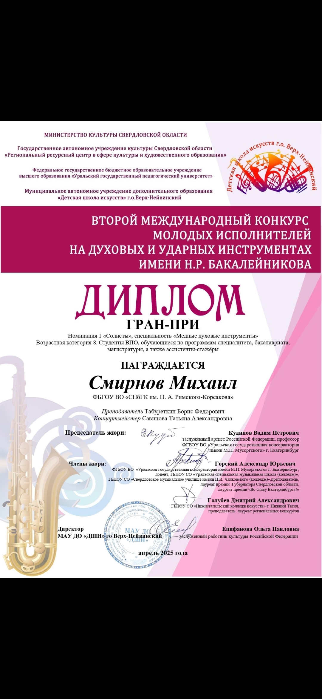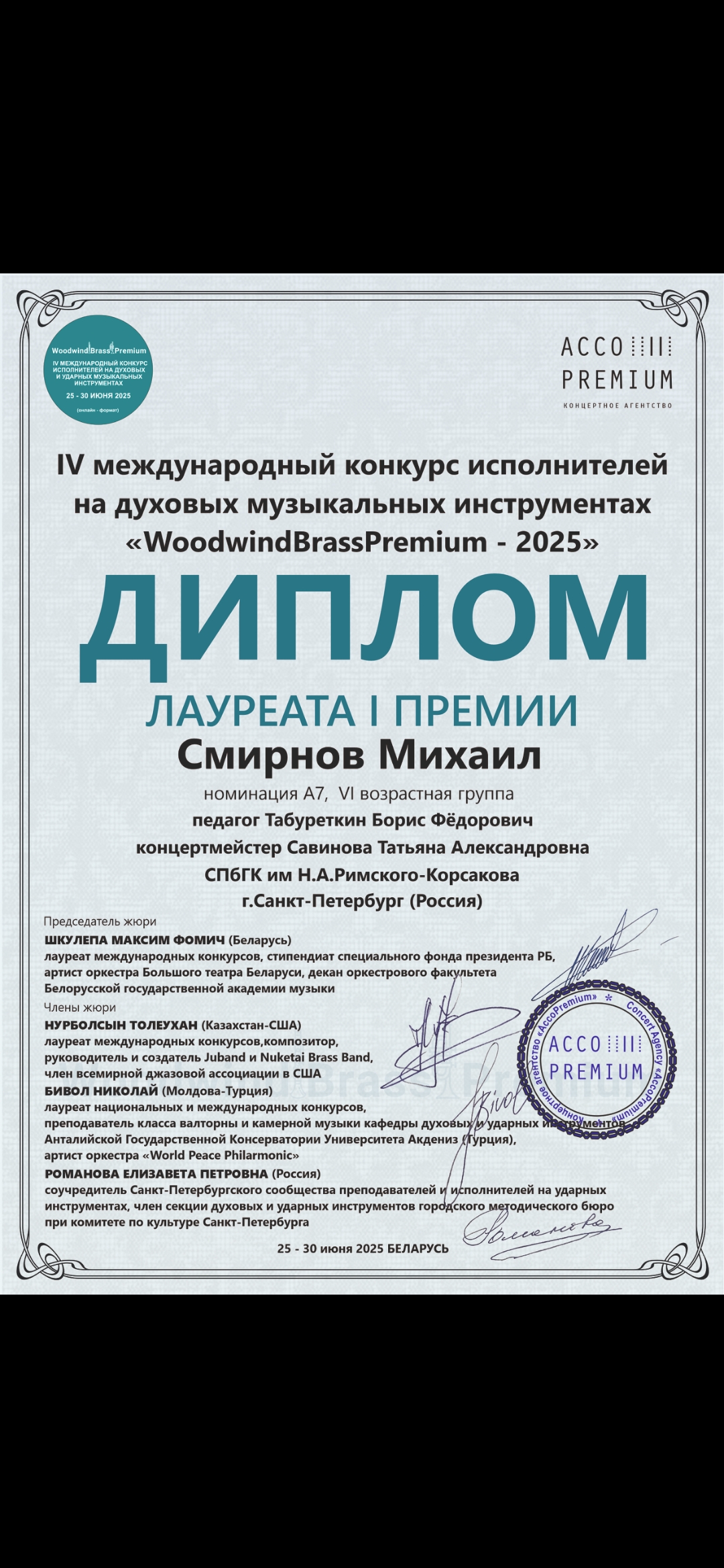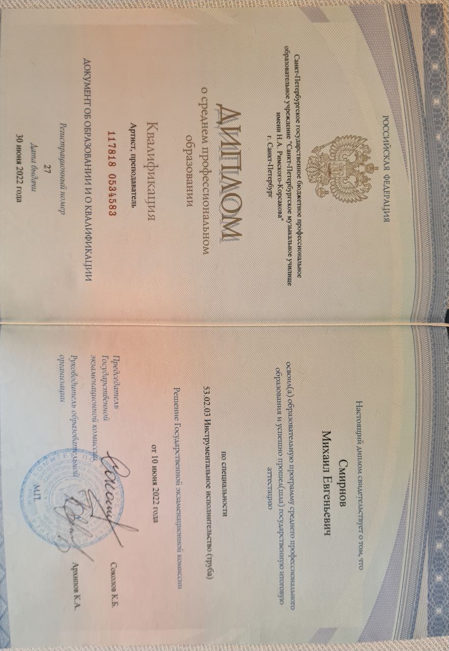 Всем здравствуйте! Меня зовут Михаил Смирнов, я обучаю с нуля игре на трубе. Вся моя жизнь связана с музыкой и выступлениями. Играю на трубе с 4х лет, с 7 лет выступаю сольно с оркестрами, являюсь лауреатом Всероссийских и международных конкурсов. Образование: СПБГК Родители у меня музыканты, поэтому преподавание в крови. Также у меня есть опыт 7 лет преподавания, большой багаж знаний, и я хочу позволить каждому желающему реализоваться через музыку! Беру в ученики детей от 6 лет и взрослых, у кого есть своя труба или кто собирается приобрести в ближайшее время. На первое время инструмент найдем, главное - желание! Что я помогу вам освоить? - постановка губ и рук - постановка правильного дыхания - развитие музыкального слуха и чувство ритма - разные техники игры на трубе - построение композиции на примере известных песен - разучивание сольных пьес по выбору ученика или из предложенных мною - основы теории и сольфеджио (без них очень сложно осваивать трубу) Обучение проходит в Академии Воронцова. Рядом ст. метро Садовая. Также преподаю онлайн.