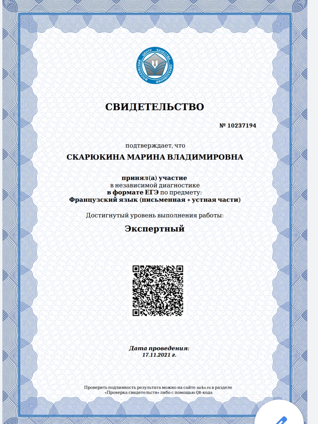 Диплом МГПУ (1997-2002г., факультет французской филологии), МЦКО (ЕГЭ) ЭКСПЕРТ (2021г.). Подготовка к ЕГЭ, обучение с любого уровня. Подготовка к DELF, DALF