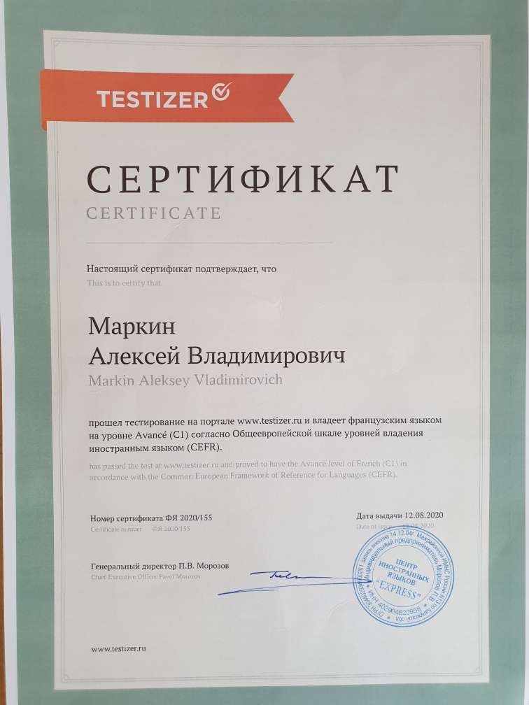 Моя специализация — это фонетика и современный разговорный французский язык. Озвучил два учебника, готовил вокалистов Большого театра. Преподаю в МГУ — «Высшая школа перевода», отделение повышения квалификации. Общаюсь с носителями, ежегодно езжу в страны, где основным языком является французский. Результат студента за 2020 год в г. Москве — 86 баллов (ЕГЭ). Готовлю к экзаменам DELF (последний результат студента (уровень В2) в мае 2020 г. — 88 баллов).