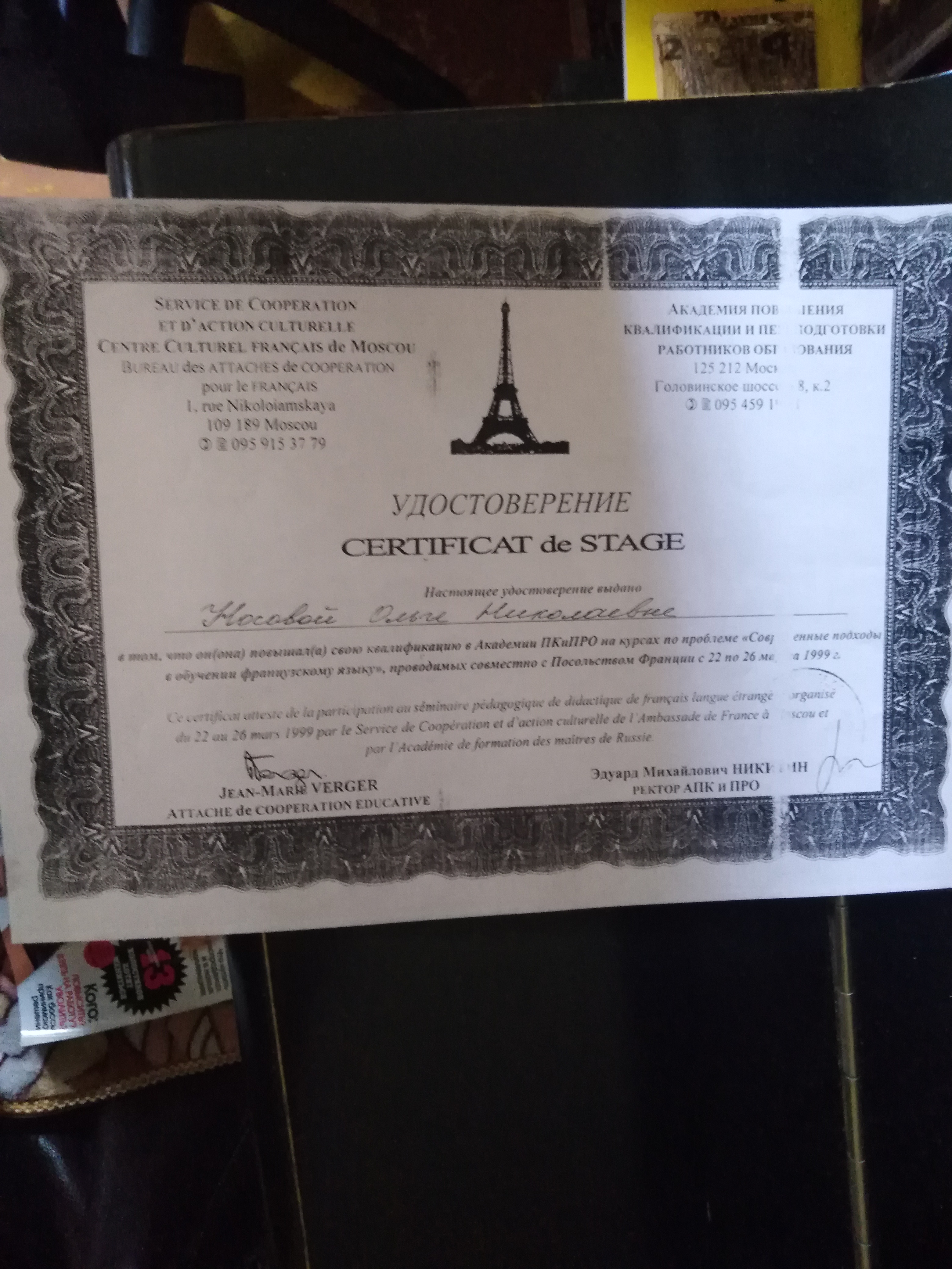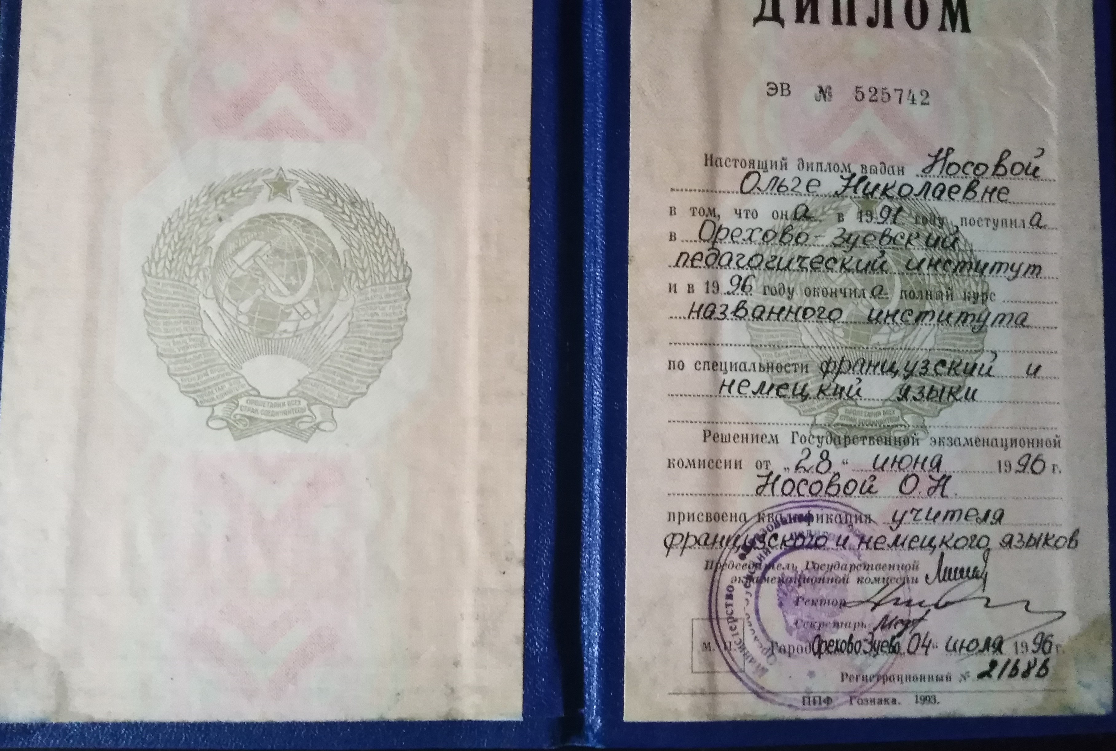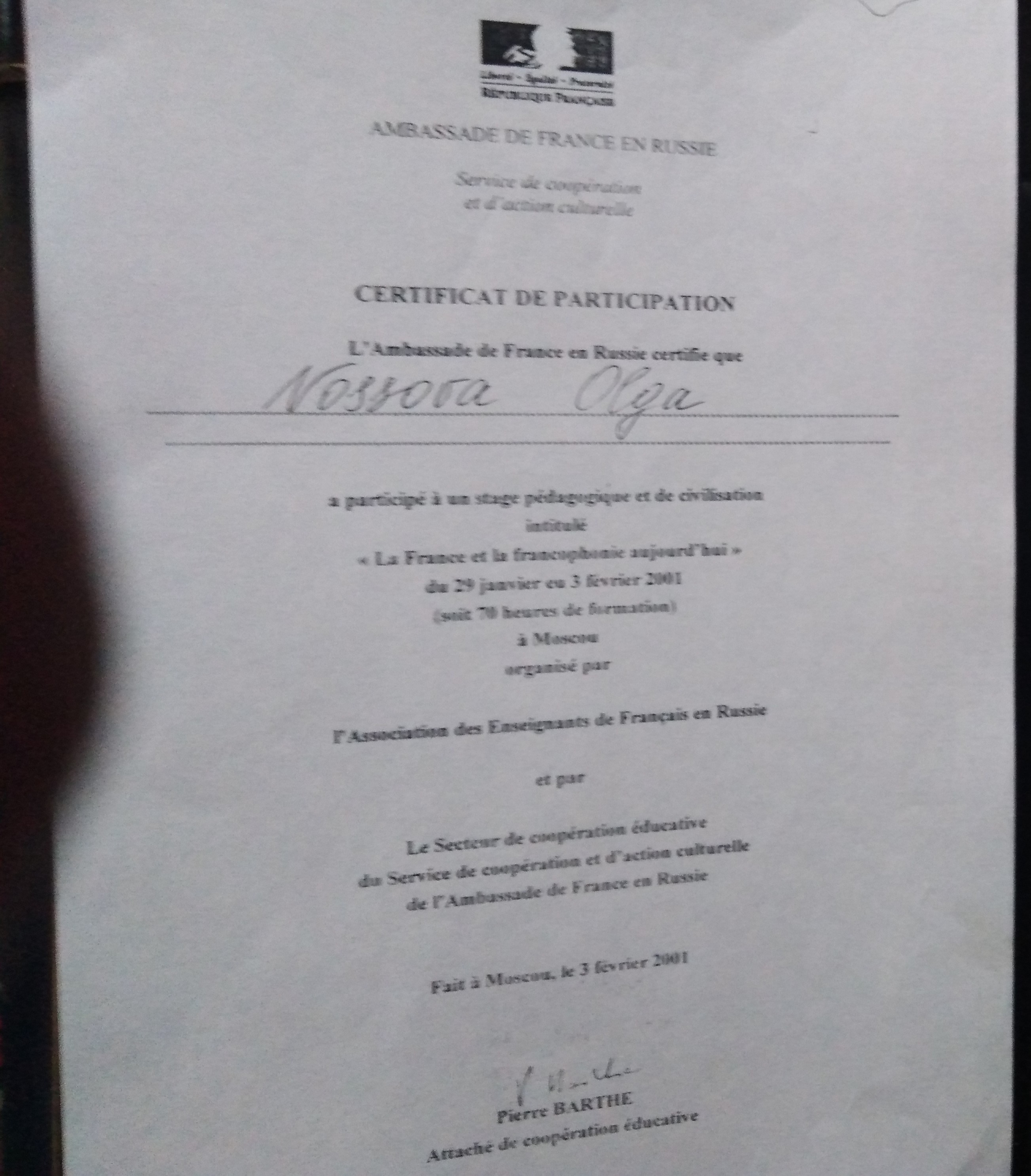 Имею высшее образование по специальности французский и немецкий языки. В сфере образования 28 лет: 8 лет отработала в средней общеобразовательной школе; 6 лет - педагогом дополнительного образования; с 2010 года преподаю французский язык в Школах изучения иностранных языков. Имею опыт работы за границей в Габоне (Африка). Имею широкий кругозор, всегда в курсе значительных событий, происходящих в системе образования. Большое внимание уделяю самообразованию и повышению квалификации. Награждена Почетной грамотой за I место в районной олимпиаде по французскому языку. Мои принципы в работе: а) привить любовь к французскому языку, б) развить у обучаемых умение мыслить, в) главное - развить навыки коммуникативного общения. Для развития коммуникативных навыков я использую полилоги, диалоги; для закрепления лексического и грамматического материала - ролевые игры, тесты; для развития произносительных навыков - изучение песен.
