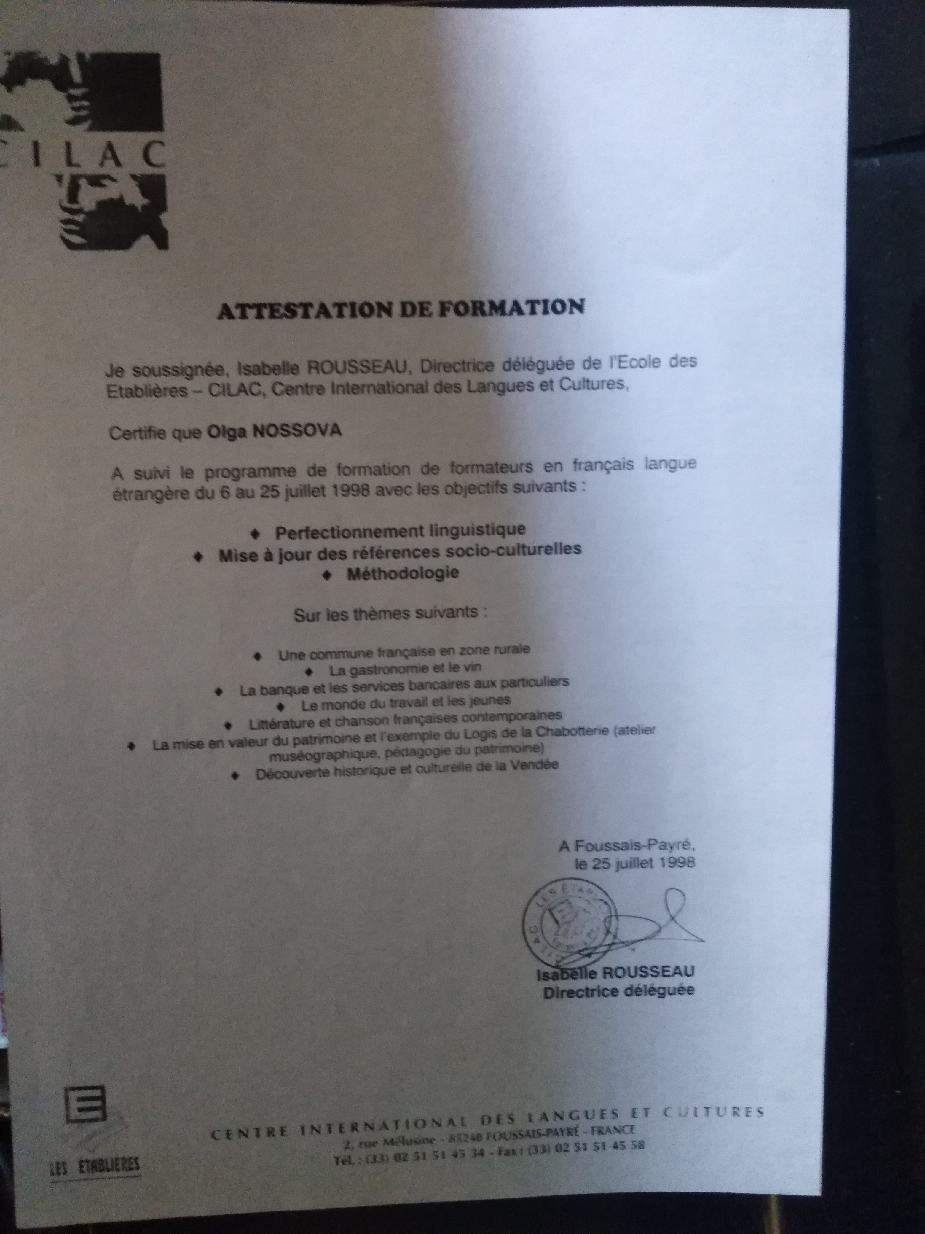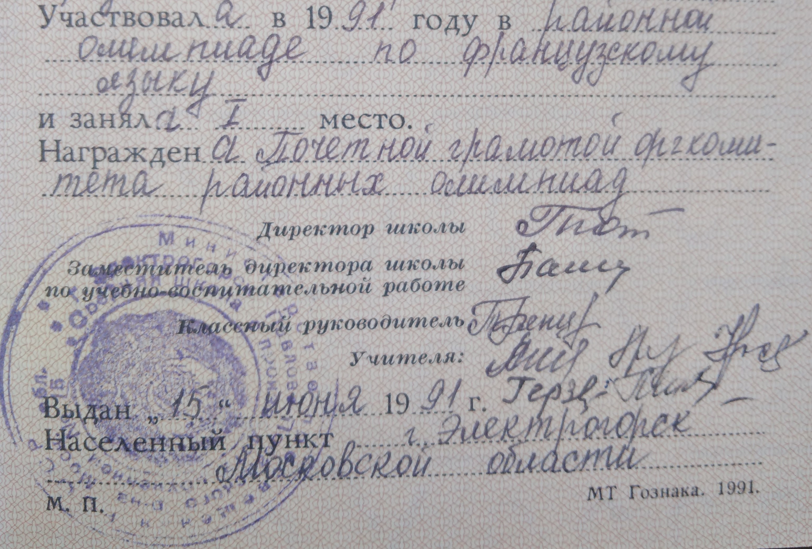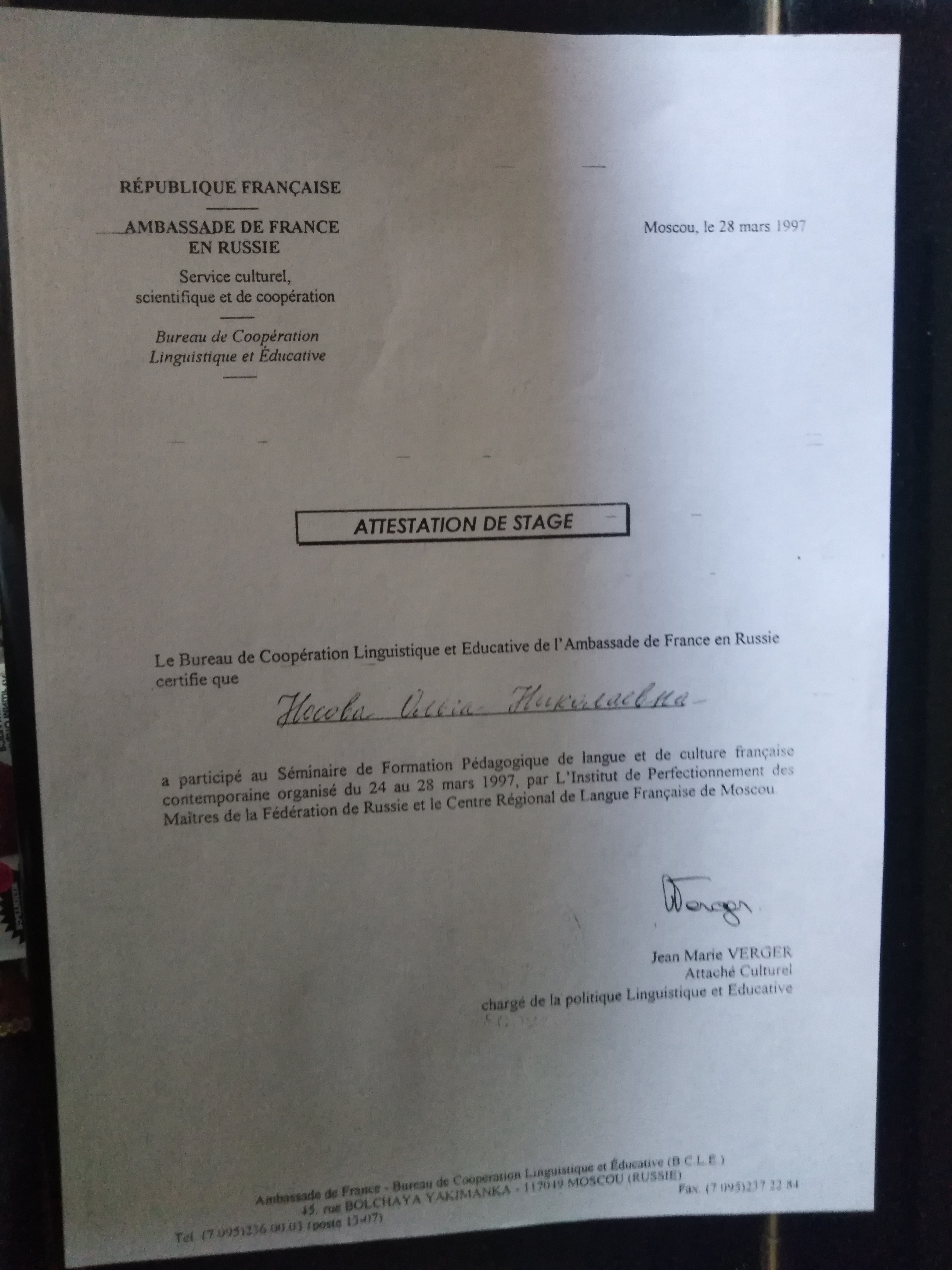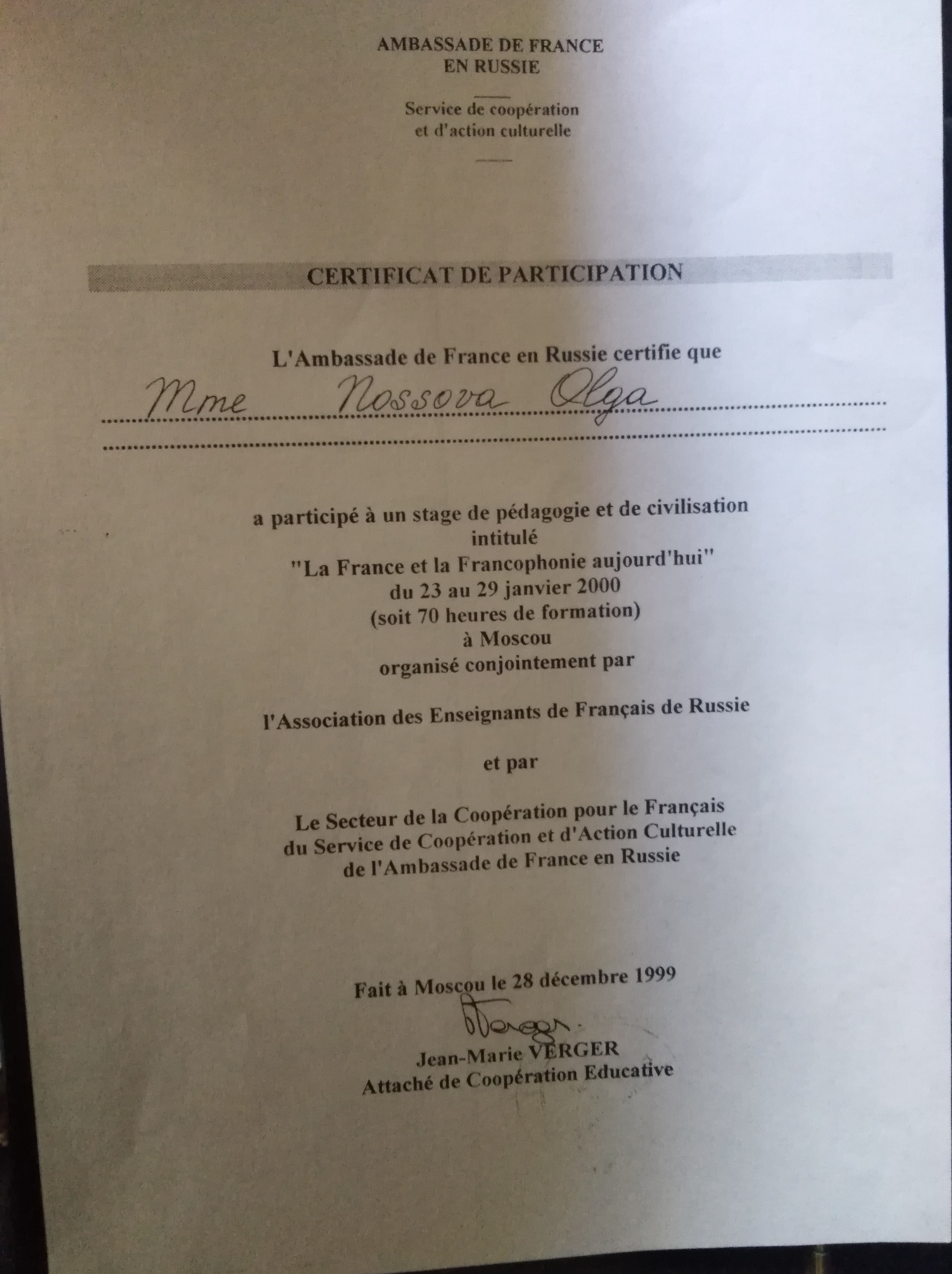 Имею высшее образование по специальности французский и немецкий языки. В сфере образования 28 лет: 8 лет отработала в средней общеобразовательной школе; 6 лет - педагогом дополнительного образования; с 2010 года преподаю французский язык в Школах изучения иностранных языков. Имею опыт работы за границей в Габоне (Африка). Имею широкий кругозор, всегда в курсе значительных событий, происходящих в системе образования. Большое внимание уделяю самообразованию и повышению квалификации. Награждена Почетной грамотой за I место в районной олимпиаде по французскому языку. Мои принципы в работе: а) привить любовь к французскому языку, б) развить у обучаемых умение мыслить, в) главное - развить навыки коммуникативного общения. Для развития коммуникативных навыков я использую полилоги, диалоги; для закрепления лексического и грамматического материала - ролевые игры, тесты; для развития произносительных навыков - изучение песен.
