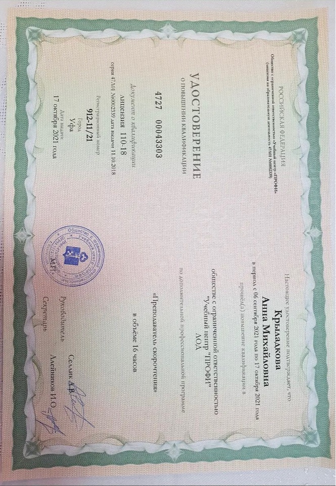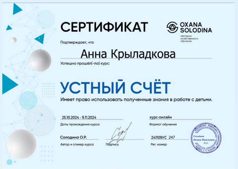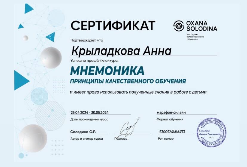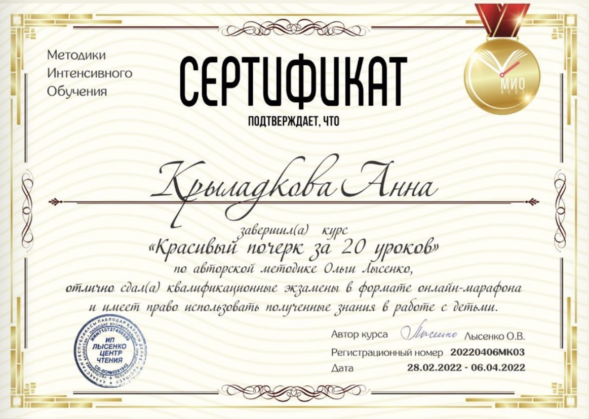 Здравствуйте! Меня зовут Анна Михайловна. Я - учитель начальных классов. Победитель конкурса «УЧИТЕЛЬ ГОДА» 20 лет я проработала в школе. Последние 10 лет занимаюсь частной педагогической практикой. Имею образование детского психолога и логопеда, тренера по Скорочтению и Каллиграфии. Мои ученики занимают призовые места в международных олимпиадах и конкурсах. Знаю, как любую сложную тему объяснить простым языком. Умею найти подход к каждому ребёнку и заинтересовать его занятиями. Работаю по методикам интенсивного обучения, с использованием метода Мнемотехники (образное мышление) В чём мои преимущества: 🔻За очень короткое время дети получают хорошие, стабильные результаты. Например: ✅курс «Устный счёт в пределах 100» ребёнок может освоить всего за 10 занятий и скорость счёта увеличится в 3-5 раз. ✅ Тему «Падежи» - за 3 занятия ✅ «Фонетика от А до Я» - за 5 занятий. Причём запомнит ребёнок без всякой зубрёжки и надолго. 🔻ЧЕМ Я ЕЩЁ МОГУ ПОМОЧЬ: ✅Подготовка ребёнка к школе (комплексная:включать в себя обучение чтению, счёту, письму) ✅Устранение пробелов по школьной программе (математика, русский язык) ✅Помощь в выполнении Д/З ✅Постановка и коррекция почерка (каллиграфия) ✅Обучение чтению с нуля ✅Скорочтение (работа над скоростью и осознанностью) Перед началом занятий проводу Диагностику, на основе которой составляю ИНДИВИДУАЛЬНУЮ ПРОГРАММУ ОБУЧЕНИЯ. 🔻Лучший результат для меня - это довольные ученики, благодарные родители и то, что многие приходят по сарафанному радио)