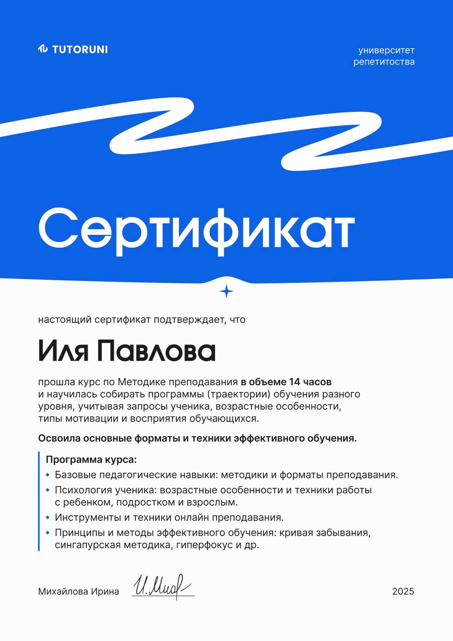 Хороший репетитор, нам очень повезло. Ребёнок раньше математику на дух не переносил, а теперь сам уроки делает и даже интерес появился. Ольга Евгеньевна объясняет очень понятно и спокойно, без нервов. Видно, что ей правда важно, чтобы ученик разобрался. Оценки стали лучше, но главное - ребёнок перестал бояться предмета. Очень её рекомендую.
