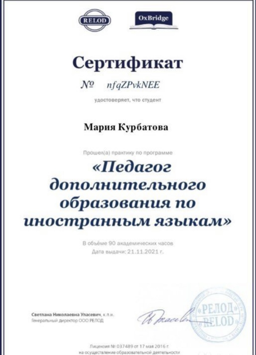 Меня зовут Мария и я — тот самый, чуткий и внимательный преподаватель по английскому языку для Вашего ребенка. От первых слов до свободного общения — без стресса и зубрежки. 🏆Результаты моих учеников: • Знание алфавита, базовых слов и конструкций — до начала школьной программы • Навык уверенного чтения за 3 месяца • С оценки «2» до «4» и «5» за полгода • Призовые места в олимпиадах • Повышение уверенности и интереса к предмету даже у тех, кто раньше боялся английского 👩🏻🏫Я — преподаватель с опытом работы в лингвистическом лицее, рейтинговой Московской школе, детских лагерях, а также веду частную практику уже более 5 лет. Я — магистр педагогики, владею методиками работы с детьми и подростками по британской системе, технологиями нейропедагогики. Самое главное — я сама обожаю английский и рада помочь Вашим детям в изучении этого полезного инструмента в современном мире. Провожу комфортные и эффективные занятия в группах и индивидуально. ❓Почему выбирают именно мои занятия: 1) Современный английский — мы не ограничиваемся учебниками! Используем любимые детьми мультфильмы, песни и игры. Занятия проходят на современной, удобной платформе, где все создано для увлеченного обучения. 2) Постепенное погружение в английский язык — от простых слов и фраз к уверенному использованию языка в речи. 3) Комфортная атмосфера и поддержка — на моих уроках дети не боятся ошибаться. 4) Реальные результаты — повышение успеваемости в школе, победы в олимпиадах и, главное, уверенность и мотивация учить язык дальше. 5) Для меня важен не только результат, но и путь ребенка к нему — я не тороплю и не давлю. Вместо этого — создаю атмосферу поддержки и доверия, где ребенок раскрывается, начинает верить в себя и учится с удовольствием. Мой подход — объяснять сложное простым языком. Дать материал в интересном формате, а не сухие факты, ведь желание изучать предмет — залог успешных результатов! Моя задача — не просто обучать, а помогать детям раскрывать свой внутренний потенциал, видеть себя и верить в себя. 📚В своей работе я опираюсь на три ключевых принципа: 1) Понимание. Каждый ребенок — уникален. Я умею видеть не только уровень знаний, но и настроение, скрытую тревогу, мотивацию. Это помогает выстраивать индивидуальный подход и повышать интерес к предмету. 2) Поддержка. Я создаю атмосферу эмоциональной безопасности, где ребенок не боится ошибаться. Вместо давления — уважение и партнерство. Вместо критики — направление и вдохновение. 3) Результат. Я всегда ориентируюсь на развитие: как академическое, так и личностное. Моим ученикам становится легче не только учиться, но и думать, чувствовать, выбирать. Именно это дает им стойкость и уверенность в будущем. 👩🏻💻Как проходят занятия: Уроки проходят онлайн в Zoom — удобно, доступно, не нужно тратить время на дорогу. Использую современные интерактивные платформы, например: Wordwall, Genially, Miro. 💫Преимущества такого формата: •Полное вовлечение и погружение в английский язык — уроки проходят в формате игры, квеста, общения, а не монотонного объяснения. •Разнообразие форматов — презентации, игры, викторины, совместная работа на онлайн-доске. •Все материалы хранятся на онлайн платформе — родитель всегда может посмотреть какие темы мы прошли и какой у нас прогресс. 📑Как проходит первое занятие: Для малышей — зна