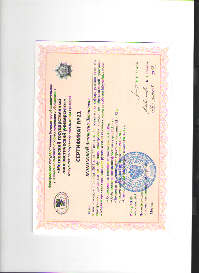 Я являюсь преподавателем Дипломатической академии Министерства иностранных дел, Московского государственного лингвистического университета и Российской академии народного хозяйства и государственной службы при Президенте РФ. В качестве переводчика и преподавателя сотрудничаю со многими известными компаниями (например, Bosco di Ciliegi и Elica Trading, "Право и Слово"). Я являюсь профессиональным переводчиком (курс синхронного перевода), профессиональным преподавателем с педагогическим образованием, исследователем. Я являюсь специалистом по культуре, истории, искусству. Обучалась на курсе Seeing Through Photographs в Museum of Modern Arts. Среди прочего, готовлю к поступлению в зарубежные учебные заведения, полное сопровождение.