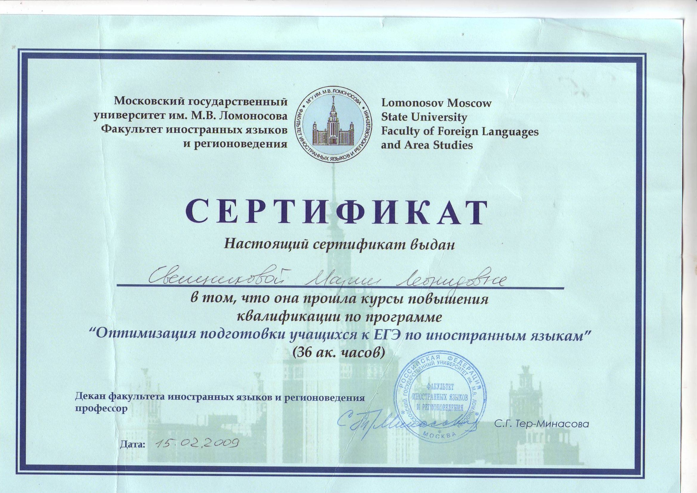 Международный сертификат по преподаванию английского языка TEFL/TESOL 2023 г. (лицензионный документ, дающий право преподавать английский язык по всему миру и подтверждающий уровень знания и владения этим языком. Сертификат аккредитован британским центром ACCRIN и признается во всем мире.). Эксперт ЕГЭ по английскому языку, подтверждено в июне 2023 года. Результаты учеников: • поступили на бюджет в МГИМО, МГУ, МГЛУ, ВШЭ, РАНХИГС; • результат ЕГЭ — 90, 93 и 94, 95 и 98 баллов; • результат ОГЭ — оценка «5»; • Всероссийская олимпиада — призер по области; — Ломоносовская олимпиада — 98 баллов. — Олимпиада «Воробьевы Горы» — 98 баллов. • TOEFL — 100 баллов. — IELTS — 8 баллов Закончила курсы по подготовке к международному экзамену IELTS при Британском Совете, Готовлю к международным экзаменам IELTS, TOEFFL, DUOLINGO, CAE, KET, PET, FCE, CAE и внутренним вступительным испытаниям в университеты. Преподаватель МГУ, преподаю общий английский, business and legal English, награждена грамотой по развитию факультета иностранных языков и регионоведения МГУ. Вошла в библиографический справочник лучших преподавателей МГУ. Автор серии учеников по английскому языку (в соавторстве), прошла стажировку в Англии по преподаванию английского языка, училась в американском университете — курс юридического английского. Переводчик-синхронист. В американской программе побывала в США 20+ раз в качестве переводчика-сопровождающего. Прошла стажировку по курсу «Преподавание английского языка» в Великобритании в г. Ковентри, Окончила курс «Legal English» в Американском образовательном центре «Pericles».