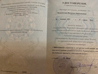 Окончила Московский Государственный педагогический институт иностранных языков им. Мориса Тореза. Учитель высшей категории. Опыт работы репетитором и учителем в частных и государственных образовательных учреждениях - 30 лет. Сдан пробный экзамен ЭГЭ. Владею стратегией и алгоритмами выполнения заданий высокого уровня сложности. Работаю с учащимися 1 - 11 классов. Повышение уровня владения языком, подготовка к олимпиадам и государственным экзаменам (ОГЭ/ЕГЭ), помощь в выполнении домашних заданий.