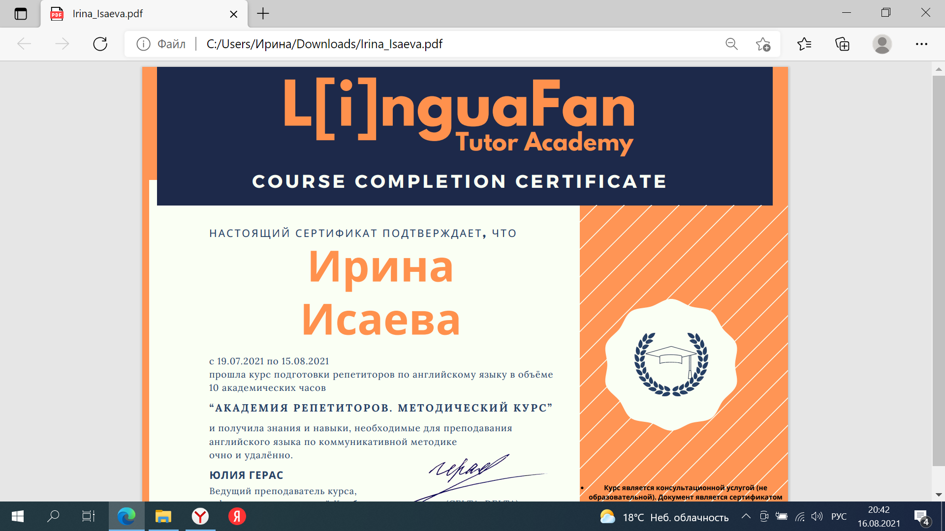 Я легко нахожу общий язык с учеником, спокойна, терпелива, обладаю неистощимым чувством юмора. Главное в моей работе - мотивация и дисциплина, готовность "убиться - но добиться". Умею просто объяснить сложное, разложить на простые части любое задание, и постоянно повторяю "Практика создает совершенство"