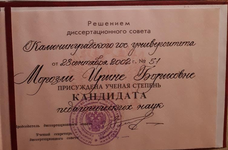 Кандидат педагогических наук (2002г.), окончила с отличием математический факультет Калининградского государственного университета им Канта (1989г.). Стаж работы в школе 17 лет. Репетиторский стаж-14 лет.