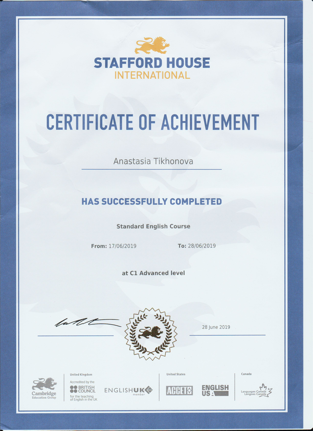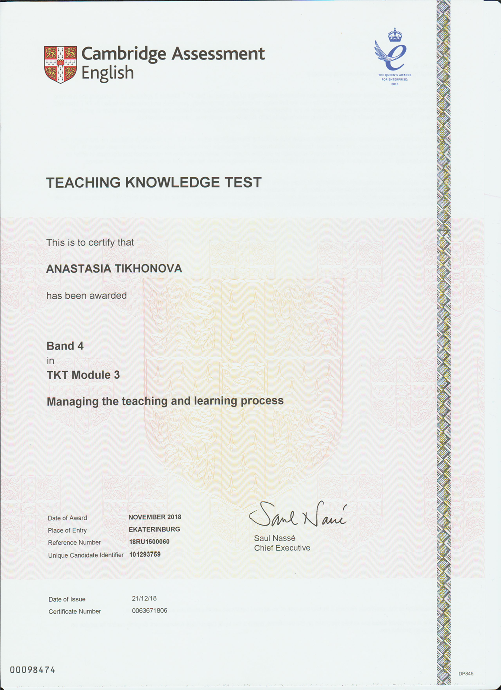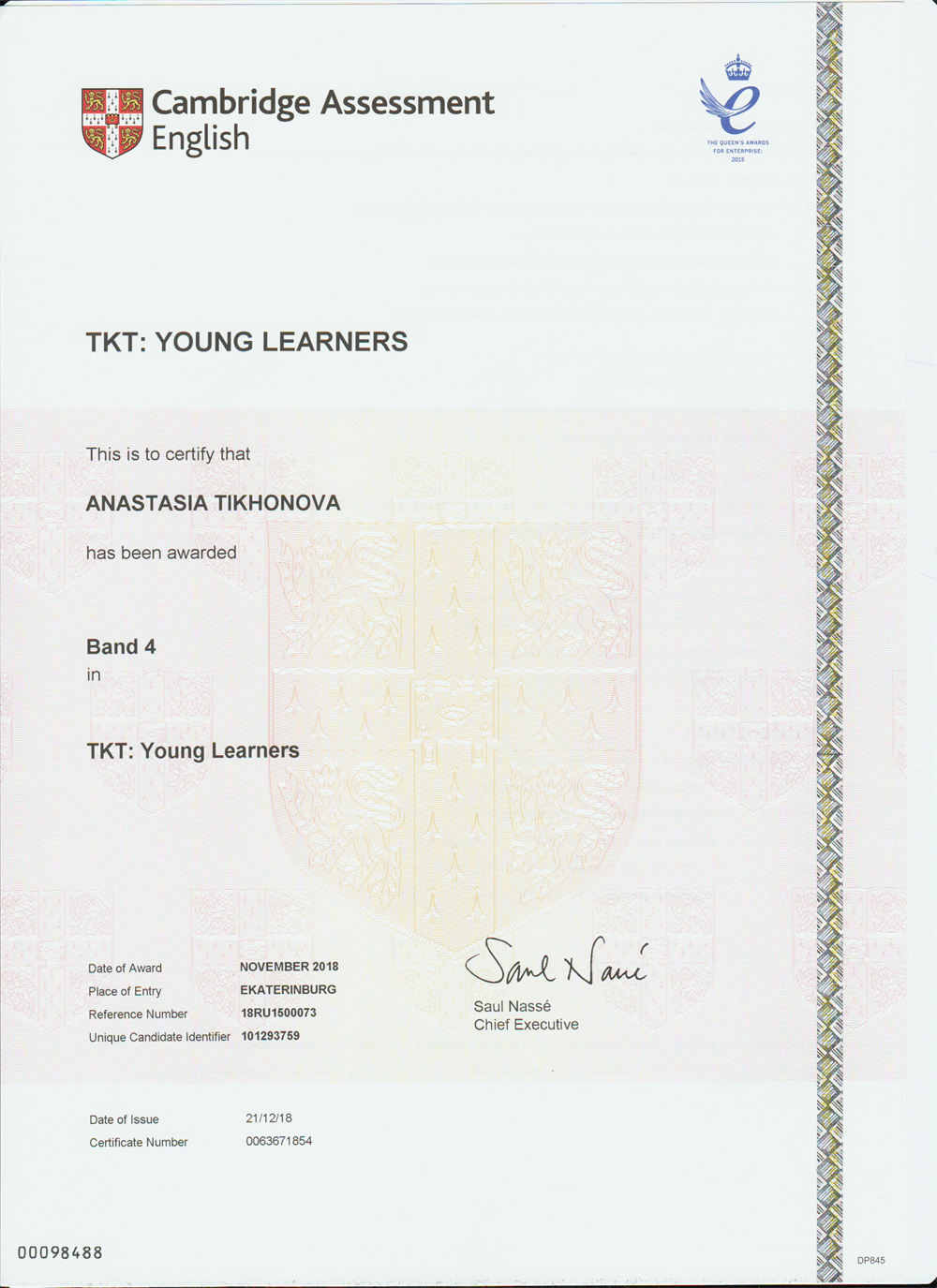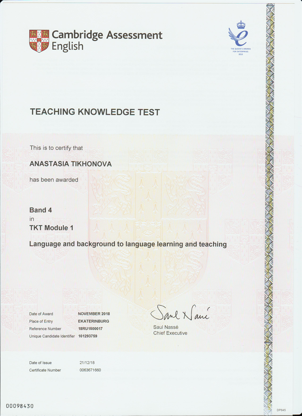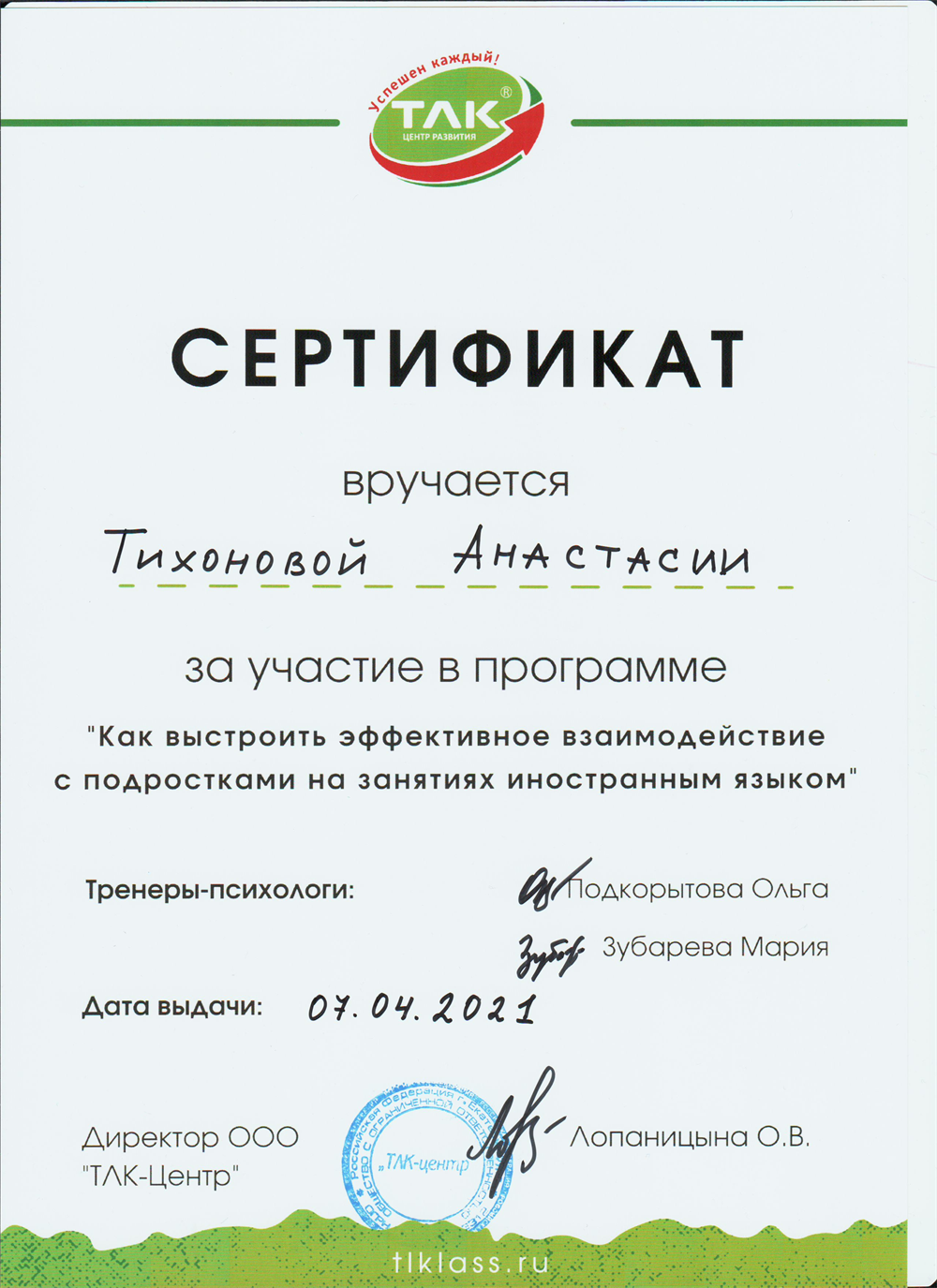 Преподаватель английского языка с 6-летним стажем подготовки к экзаменам (Cambridge Exams, ЕГЭ/ОГЭ), опытом работы в крупнейших языковых центрах города, опытом работы старшим преподавателем. Мои студенты поступают в МГУ и ВШЭ, сдают международные и государственные экзамены на высокие баллы. Специализируюсь на работе с подростками 13-17 лет.Помогу не только подготовиться к экзаменам на высокие баллы, но и повысить общий уровень языка.На моей программе вы:Продиагностируете свои навыки в английском, поставите четкие цели. Без цели - нет результата.Разработаете шаблоны для ответов на устные и письменные задания. Начнете говорить и писать сразу же. Эти части вызывают наибольшую сложность у студентов, со мной у вас будет целый год, чтобы отработать эти навыки в экзаменационном формате.Изучите все грамматические и лексические темы, которые присутствую в экзамене. Экспертами проверяется умение пользоваться различными конструкциями и выражениями. Я помогу обеспечить это разнообразие.Отработаете микроумения, необходимые для выполнения заданий на чтение и аудирование. Чтение и адуирование составляют 40% от общей оценки за экзамен. Научу техниками, которые помогут набирать максимальные баллы и не терять их.Повторите и отшлифуете все пройденные темы. Важно не только выучить, но и постоянно возвращаться к пройденным темам, таким образом мы избегаем заучивания и все знания остаются с вами на всю жизнь.На моих занятиях:мы учимся в первую очередь общаться на языке, ведь экзамен проверят наши умения в коммуникациимы регулярно отслеживаем прогресс, прорешивая пробные варианты. Родителям предоставляют отчет с результатами и комментариямия учу не только языку, но и навыкам необходимым в реальной жизни и при трудоустройстве (soft-skills)Со мной перед тобой откроются любые возможности!Успей записаться на бесплатную диагностику уровня до КОНЦА АВГУСТА и получи тестовую неделю со скидкой 50%Занятия проходят через платформу Zoom.Опыт работы:Преподавателем (5 лет):2021 — преподаватель-совместитель Языковой академии «Талисман» 2018 — 2021 — преподаватель Языковой академии «Талисман» 2016 — 2018 — преподаватель в Языковом центре YESСтаршим преподавателем (2 года):2019 — 2021 — старший преподаватель Языковой академии «Талисман» Лидером и разработчиком детских городских и выездных программ (3 года):2018 — 2021 — лидер и разработчик городских и выездных программ «Talismania» для детей и подростков 9-17 лет Постоянное повышение квалификации:С 2017 года пройдено семинаров и конференций объемом более 100 ак. часов Языковые стажировки:Июль 2006 — Англия (Рэдинг)Июль 2008 — Ирландия (Дублин)Июль 2019 — Англия (Лондон)Стоимость обучения:Разовое занятие (60мин) - 1000рАбонемент 4 занятия по 60 мин - 3800р Абонемент 8 занятий по 60 мин - 7200р