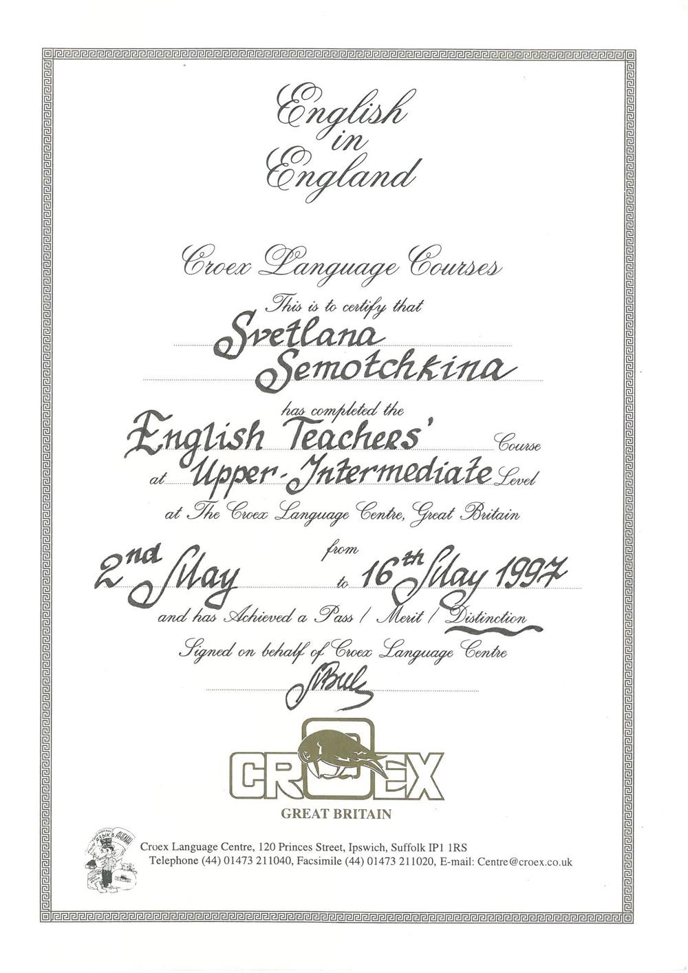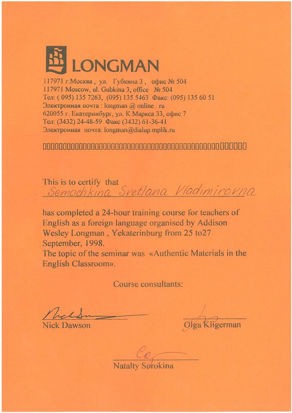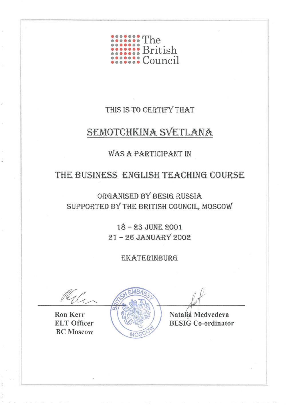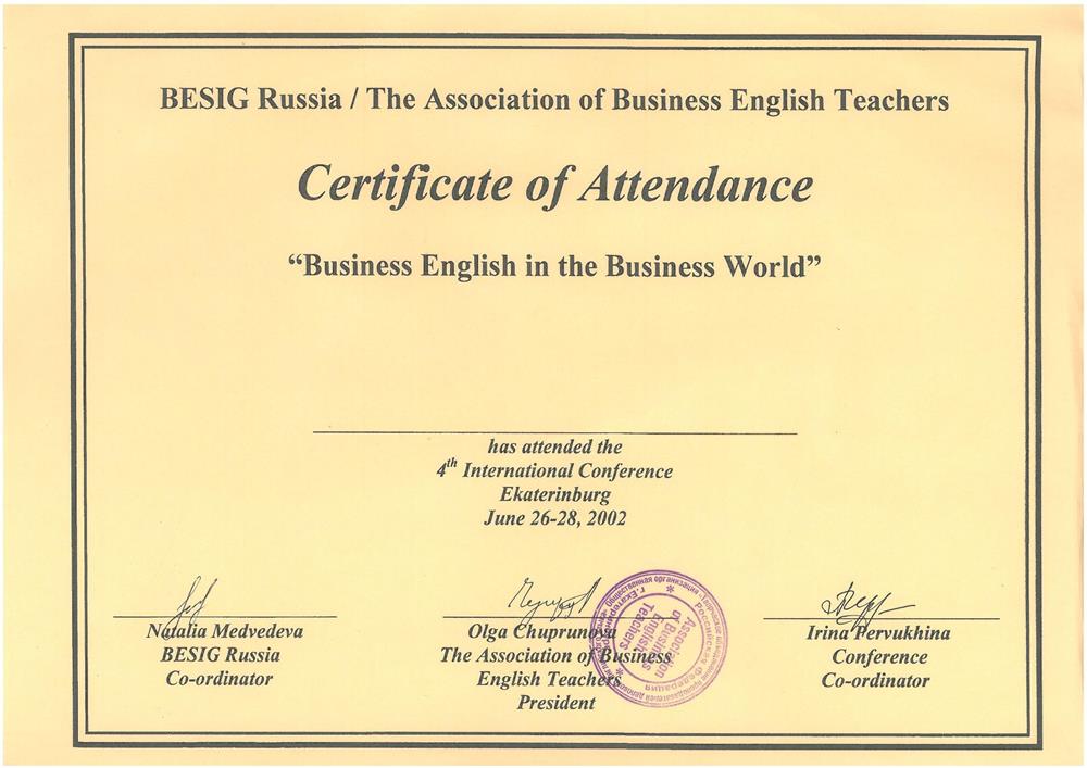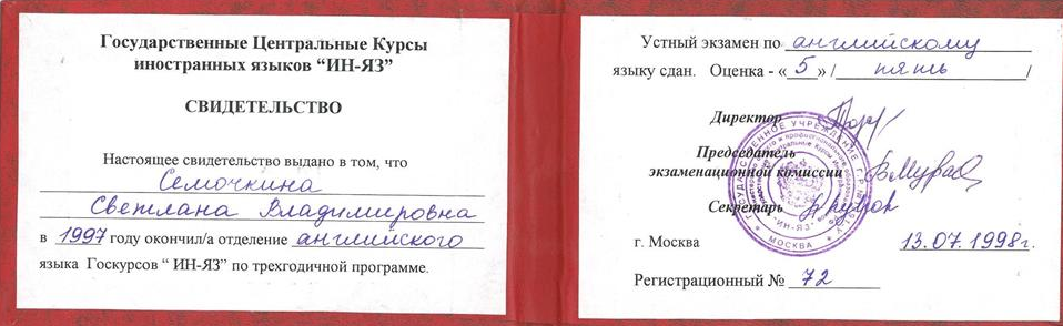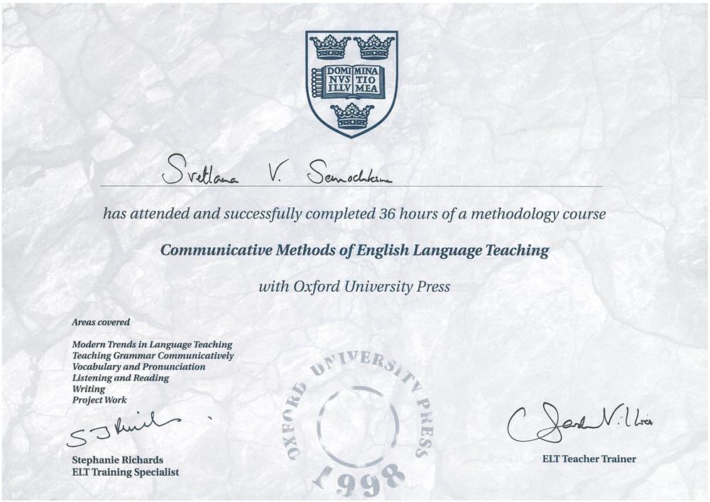 Международный факультет 2. Государственные Курсы Английского Языка (диплом), г. Москва 19933-1996г 3.Методика преподавания английского языка(Британский Совет): Британские издательства «Оксфорд», «Лонгман», «Кембридж»; «Деловой Английский », г. Екатеринбург 1997-2002г 4.Тренинг для преподавателей английского языка, Великобритания (г.Ипсвич) 1997г Май 5.Стажировка в международной лингвистической компании «Берлиц» по программе «Бизнес для России», Международный совет по научным исследованиям и обменам (IREX), США, Северная Каролина 2003г 6. Международный он-лайн университет Курсера, курс “Learning how to learn!” (Как надо учиться!) 2016г