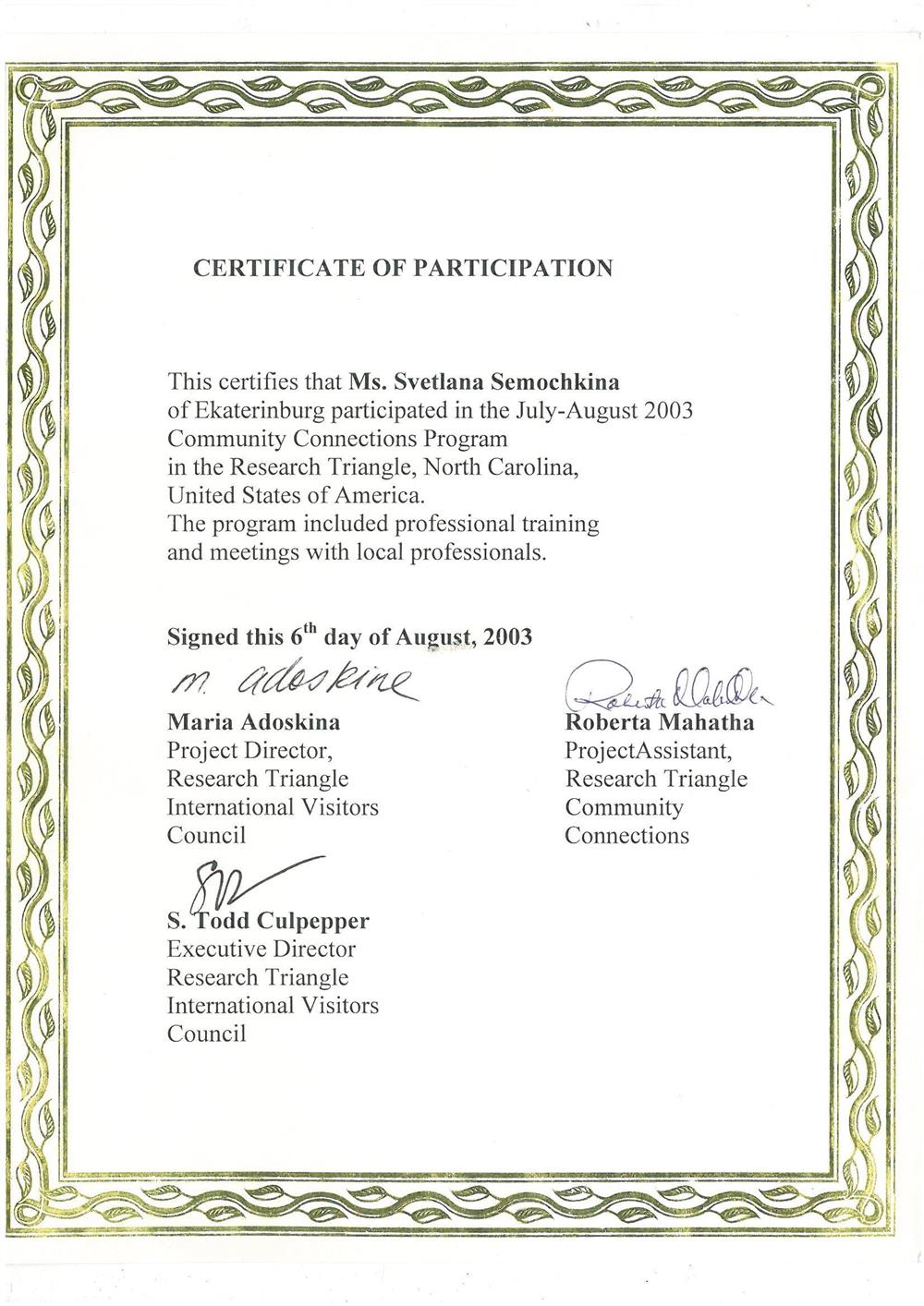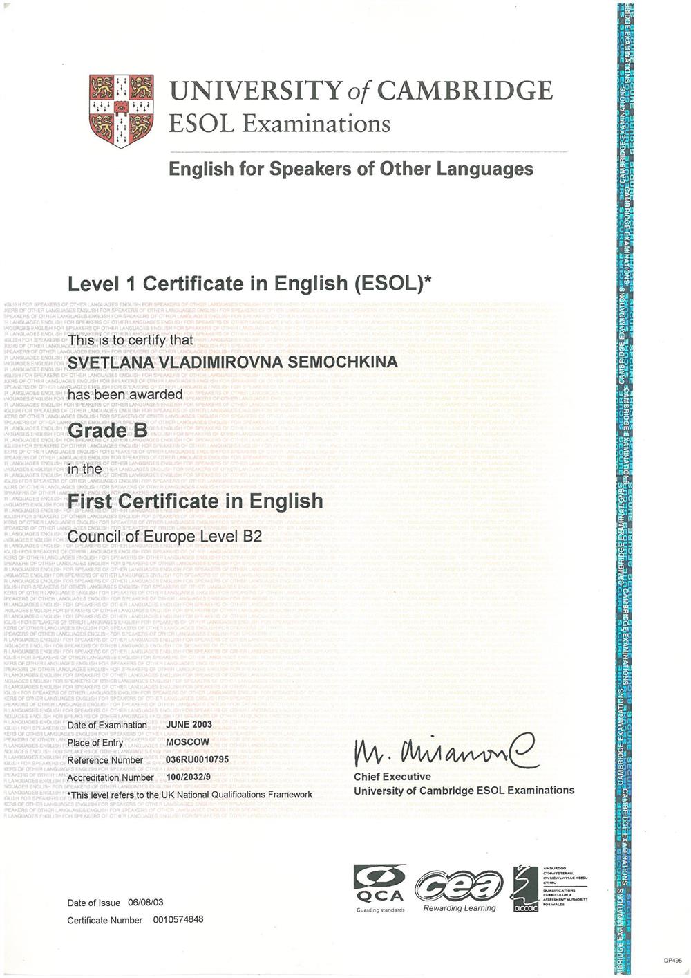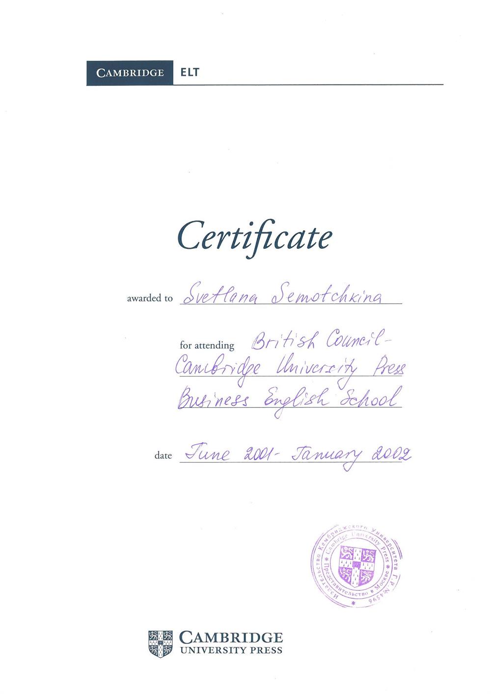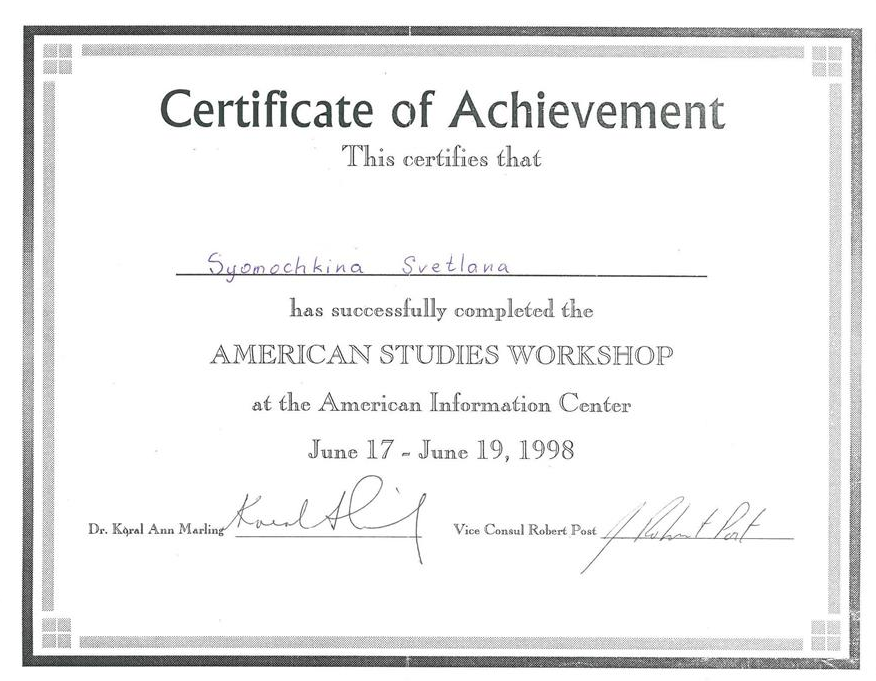 Международный факультет 2. Государственные Курсы Английского Языка (диплом), г. Москва 19933-1996г 3.Методика преподавания английского языка(Британский Совет): Британские издательства «Оксфорд», «Лонгман», «Кембридж»; «Деловой Английский », г. Екатеринбург 1997-2002г 4.Тренинг для преподавателей английского языка, Великобритания (г.Ипсвич) 1997г Май 5.Стажировка в международной лингвистической компании «Берлиц» по программе «Бизнес для России», Международный совет по научным исследованиям и обменам (IREX), США, Северная Каролина 2003г 6. Международный он-лайн университет Курсера, курс “Learning how to learn!” (Как надо учиться!) 2016г