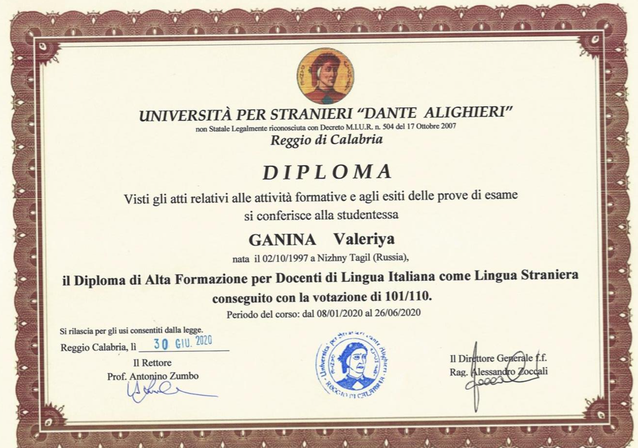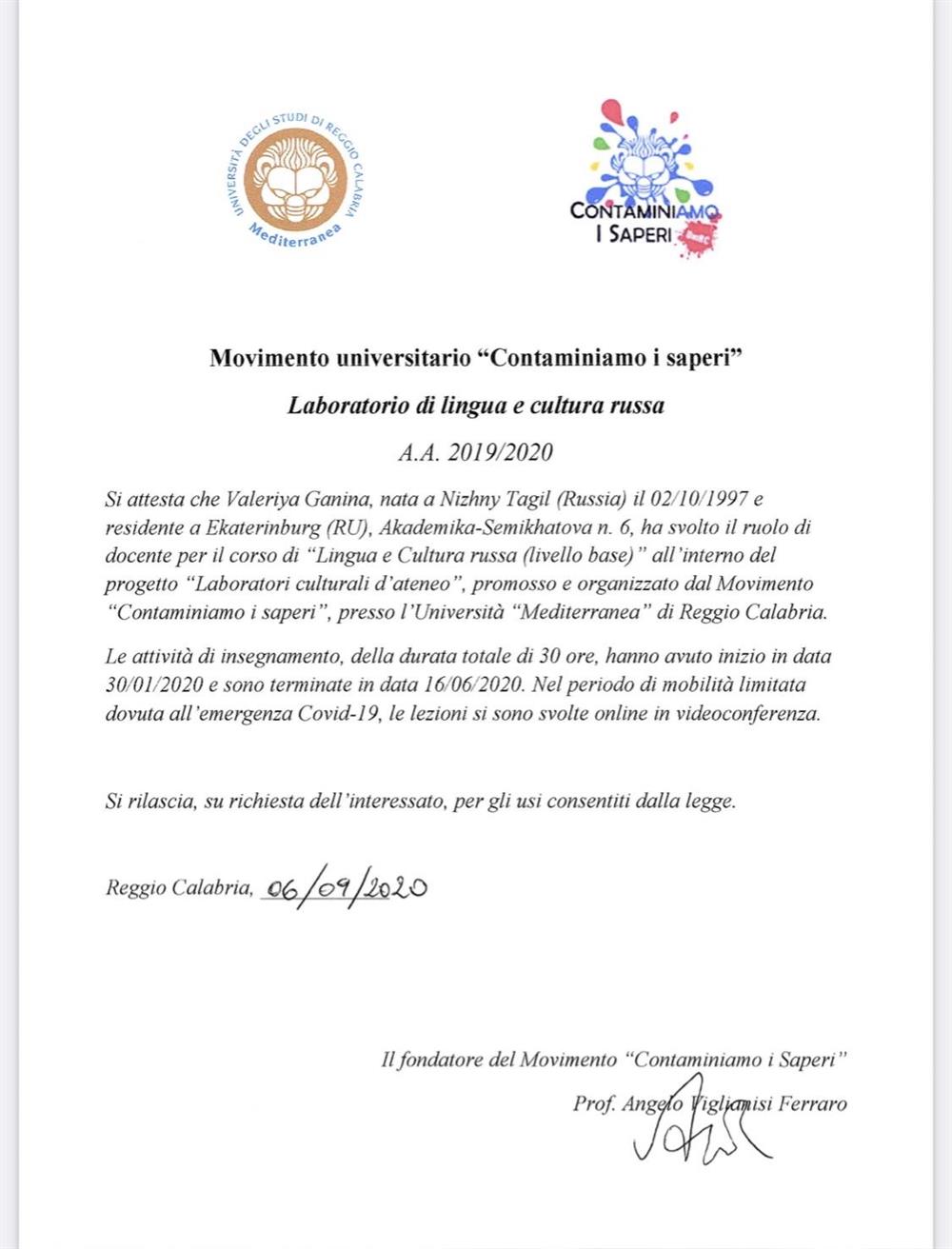 L'universita degli Studi Mediterranea di Reggio Calabria, Italia. Преподаватель русского языка для итальянцев, очное обучение (январь 2020 - июнь 2020). L'universita per Stranieri "Dante Alighieri" di Reggio Calabria, Italia (июль 2018 - август 2018). Университет для иностранцев "Данте Алигьери", очное обучение.