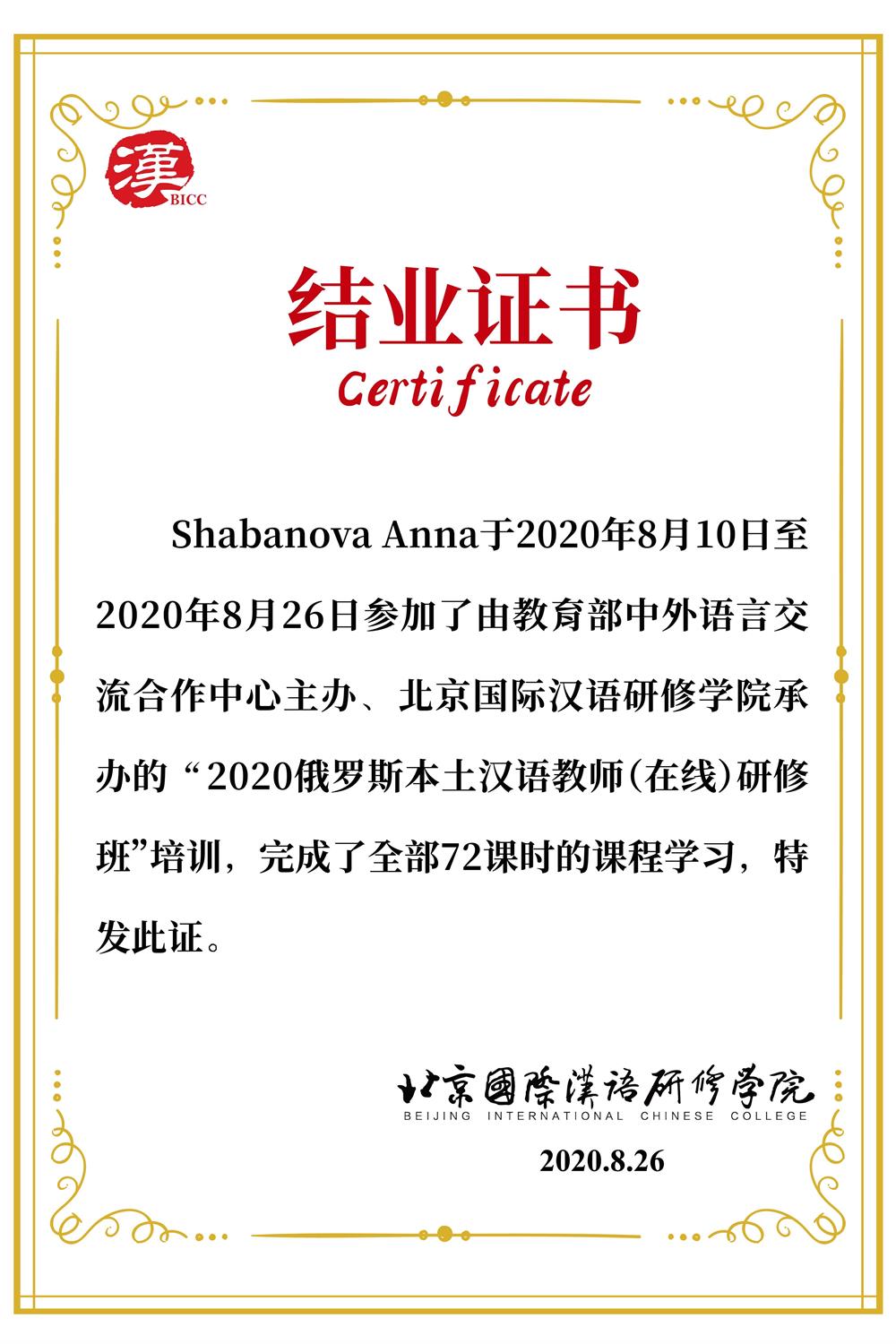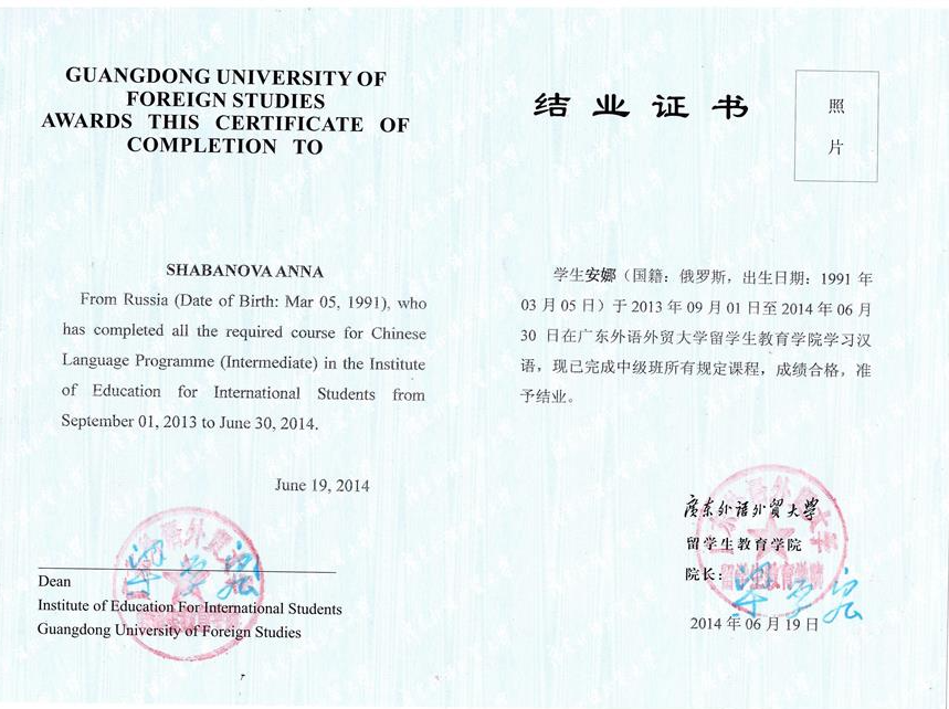 Сертификат о прохождении стажировки в Китае (2013-2014 гг.)