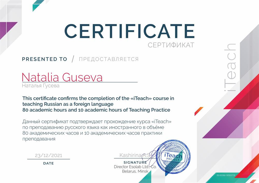 Здравствуйте, друзья! Я предлагаю онлайн-уроки русского языка как иностранного.Мой главный принцип - работа по запросу ученика для достижения его целей.Я понятно объясню грамматику и лексику. Вы научитесь писать, читать, говорить по-русски и понимать устную речь. Если Вы уже не новичок, то я помогу вам улучшить ваши навыки владения русским языком. Если Вы мечтаете легко говорить по-русски, то Вам помогут мои уроки разговорной практики!Мой стаж преподавания на международных онлайн-платформах составляет более года. Я горжусь отзывами моих учеников и с удовольствием Вам их предоставлю.Я владею методикой преподавания РКИ, прошла дополнительное обучение по преподаванию русского языка как иностранного (teaching Russian as a foreign language).Знаю французский язык, имею бессрочный государственный сертификат DELF B2 (L’Alliance Francaise Екатеринбург).Гарантирую индивидуальный подход и уважение каждому ученику.