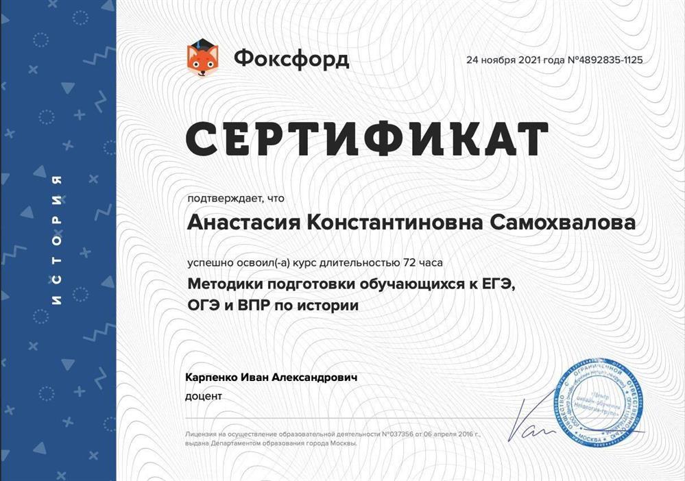 * Репетитор-эксперт по обществознанию и истории (переподготовка 2021 года)* Подготовка к ЕГЭ и ОГЭ* Бакалавр по специальностям «Организация работы с молодежью» и «Юриспруденция»* Магистр по специальности «Проектно-экспертная и аналитическая деятельность педагога»* Подготовка высокобальников, результаты 2021?2022 года 81?98 баллов* Подготовка к вступительным экзаменам в университет после СПО* Подготовка к ДВИ по истории и обществознанию в топовые ВУЗЫ страны* Индивидуальный подход к обучениюЕсть 2 варианта подготовки:1. ИндивидуальныйКаждый месяц:— Индивидуальные онлайн — занятия по 60 минут— Домашние задания на онлайн-платформе— Проверка домашних заданий преподавателем— Обратная связь от преподавателя 24/7— Дополнительные материалы, рабочие тетради— Внутренние экзамены (пробники) каждый триместр— Доступ к чату учеников и преподавателя2. ГрупповойКаждый месяц:— 8 групповых онлайн — занятия по 90 минут (Группы по 2?5 учеников)— 8 домашних заданий на онлайн-платформе— Проверка домашних заданий преподавателем— Обратная связь от преподавателя 24/7— Дополнительные материалы, рабочие тетради— Внутренние экзамены (пробники) каждый триместр— Доступ к чату учеников и преподавателяПреимущества:1. Занятия проходят в онлайн форматеБлагодаря чему ученик чувствует себя более комфортно и занимается в привычной обстановке.2. Готовлю к сдаче ЕГЭ и ОГЭБолее 100 учеников сдали экзамены на высокие баллы и поступили в ТОП-10 университетов нашей страны.3. Маленькие группы для комфортных занятийГруппы от 2 до 5 человек, это позволяет преподавателю найти индивидуальный подход к каждому ученику, устранить все пробелы в знаниях и ответить на возникающие вопросы в процессе подготовки.4. Образованный и грамотный преподавательЯ бакалавр с высшим социологическим и юридическим образованием, магистр с высшим педагогическим образованием, также постоянно прохожу повышение квалификации, в 2021 году прошла обучение на эксперта ЕГЭ по обществознанию и истории.