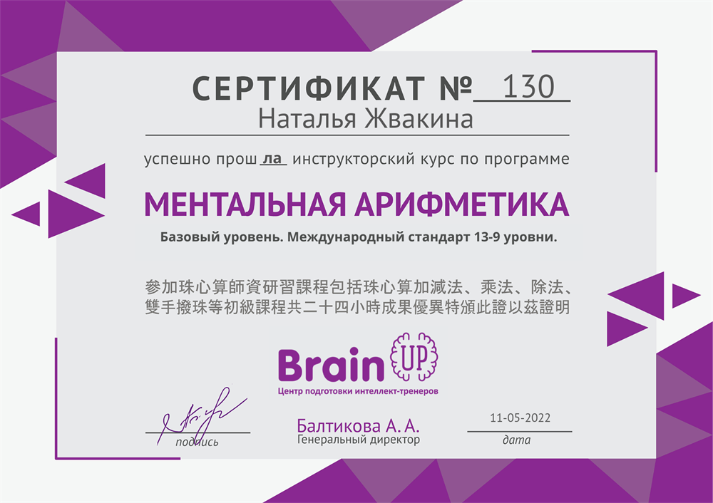 Занятия в online провожу через программу zoom. Есть возможность выполнять задания в онлайн-ренажерах.Мои ученики по ментальной арифметике принимают участие в международных олимпиадах online MINDSKILLS/ ЯВЛЯЮТСЯ ПОБЕДИТЕЛЯМИ 1, 2 СТЕПЕНИ.2 ученика успешно прошли сертификацию SAMA-GLOBAL.Успешно прошла курсы и сдала экзамены по международным стандартам в центре подготовки интеллект- тренеров BrainUp