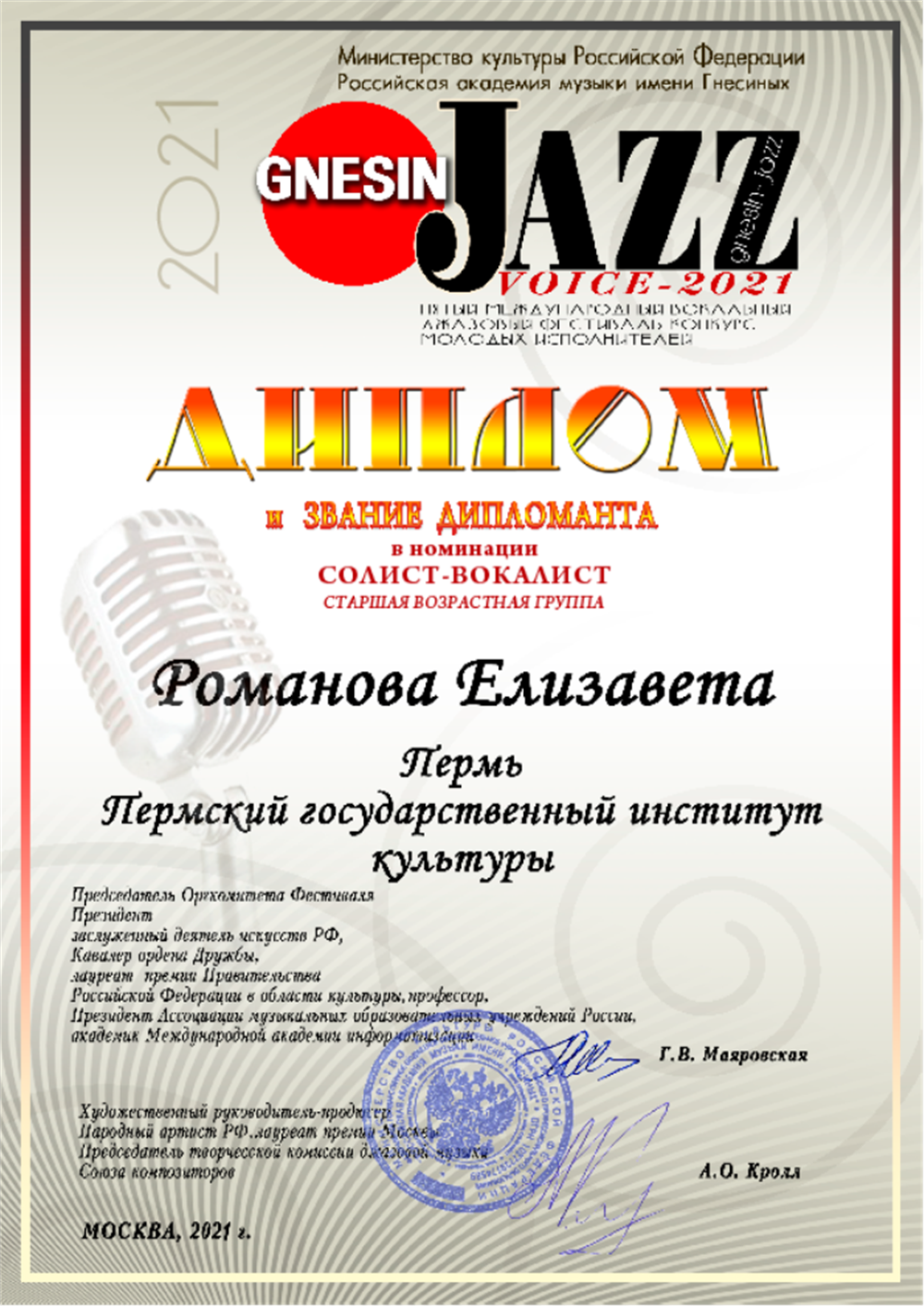 Приглашаю всех желающих на занятия по современному и джазовому вокалу. Работаю с любым уровень подготовки, главное - ваше желание учиться.Будем работать над развитием ровного и уверенного звучания. Вы узнаете свой диапазон и сможете его увеличить, поймёте, как управлять своим голосом, откроете множество нюансов в музыкальных стилях. Потренируем разные режимы звучания (микст, бэлтинг, фальцет, фрай), научимся петь мелизмы и импровизировать, уделим большое внимание тонкостям стилистики песен, улучшим ваше чувство ритма и др.Обо мне:педагог-практик с трехлетним опытом работы (индивидуальные и групповые занятия с детьми и взрослыми); опыт работы в государственном учреждении (Детская школа искусств) - 1 год, опыт работы в частной студии - 2 года;действующая певица и автор песен; выступаю в разных составах с музыкантами Екатеринбурга и Перми; сотрудничала с Пермским Губернским оркестром, биг-бэндом заслуженного артиста России Евгения Манцирина; на данный момент выступаю в джаз-клубе Ever Jazz и работаю с лучшими музыкантами г. Екатеринбургпризёр международных джазовых фестивалей (Jazz Birds - 2019, Петроджаз - 2020, Lanote Jazz - 2020, Gnessin Jazz Voice -2021)обожаю учиться сама и применять новые знания на уроках со студентами.