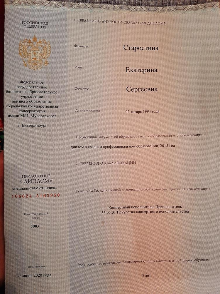 Екатерина Сергеевна - преподаватель высшей категории. Окончила аспирантуру Уральской государственной консерватории. Лауреат международных и всероссийских конкурсов. Стажировалась в Австрии в венском университете MDW. Преподаватель специальной музыкальной школы при консерватории им. Мусоргского, работала в Свердловской филармонии.