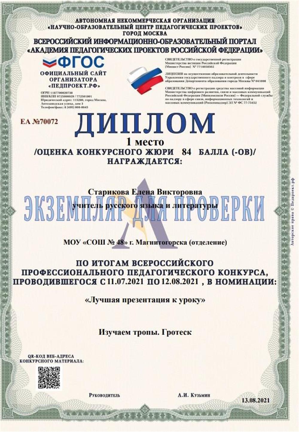 Категория -высшая. Являюсь членом региональной предметной комиссии по проверке ОГЭ (русский язык). Обучающиеся в 2022 году сдали ОГЭ без неудовлетворительных оценок.