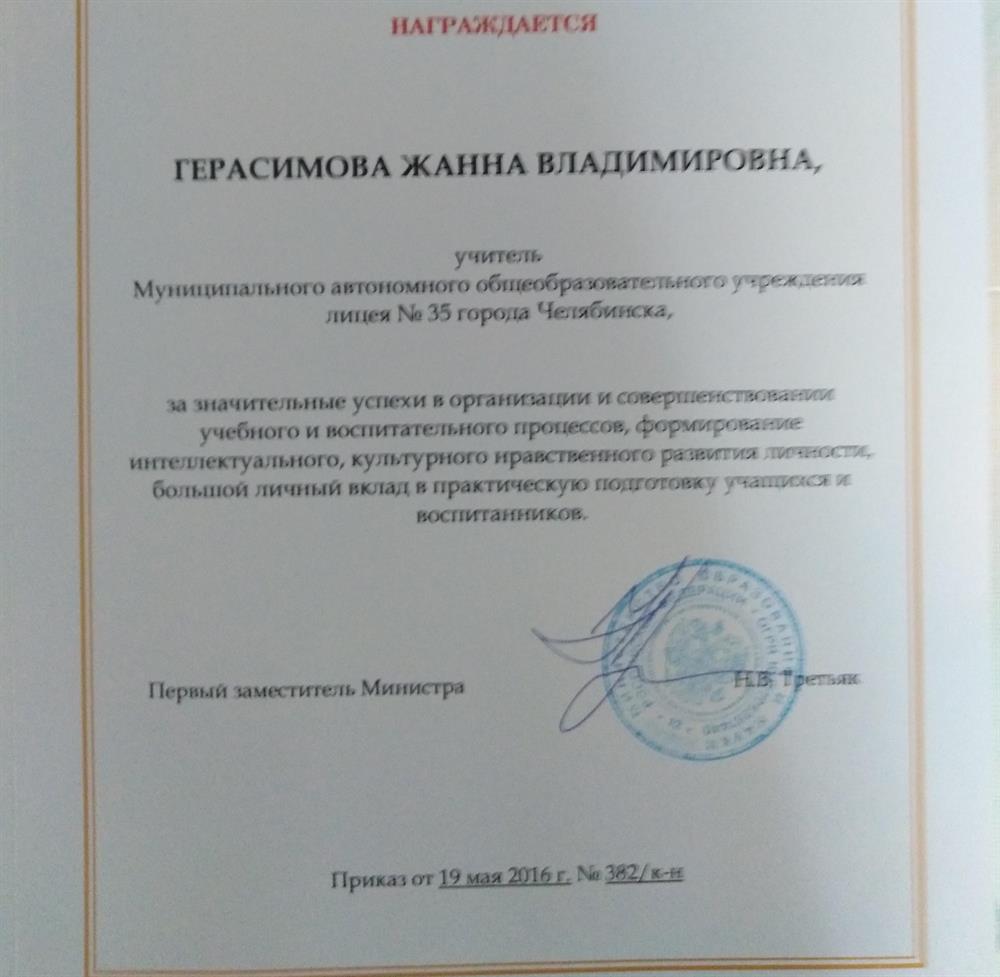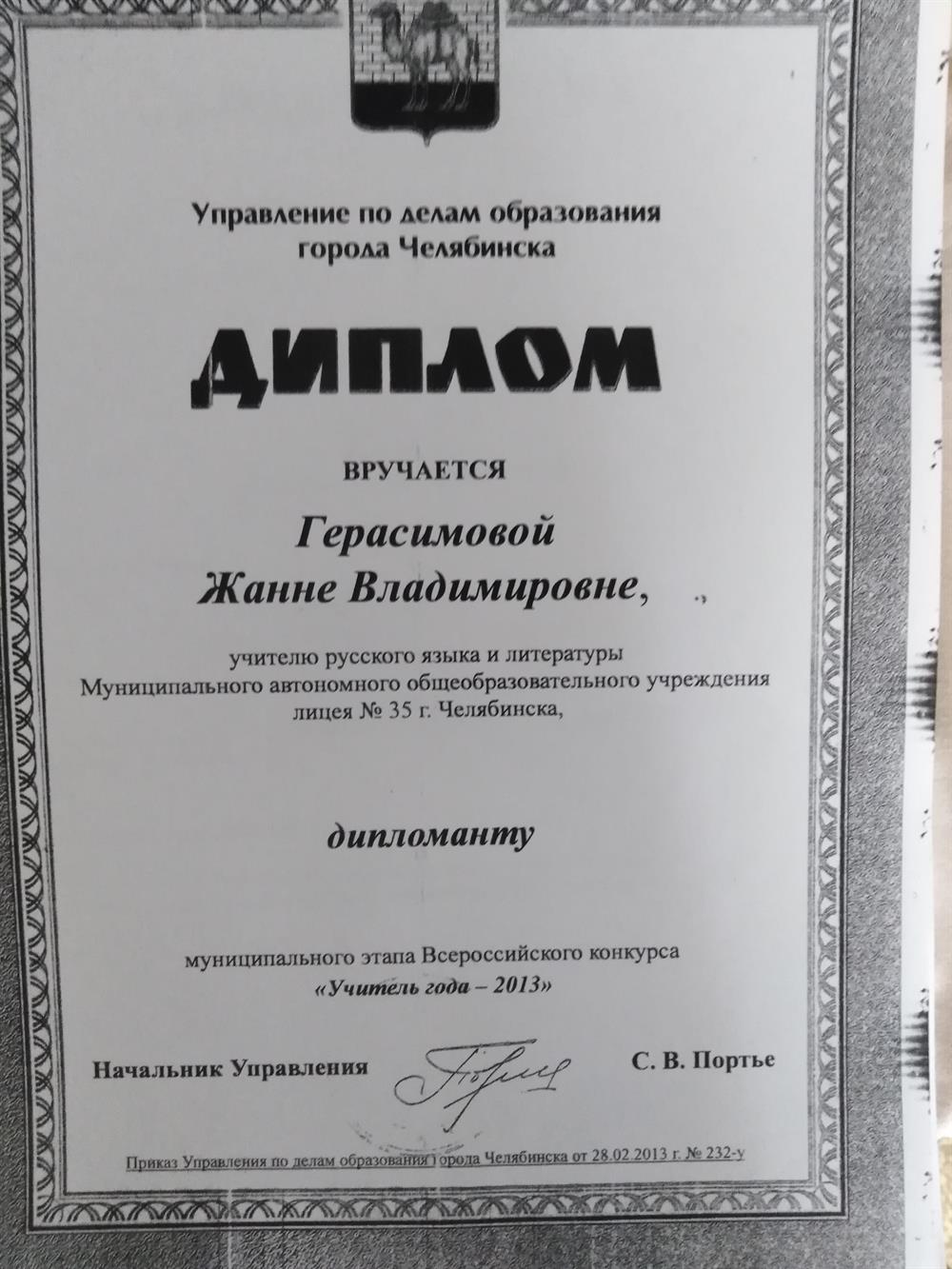 Награждена Почётной грамотой МО РФ. Дипломант муниципального этапа Всероссийского конкурса "Учитель года-2013".