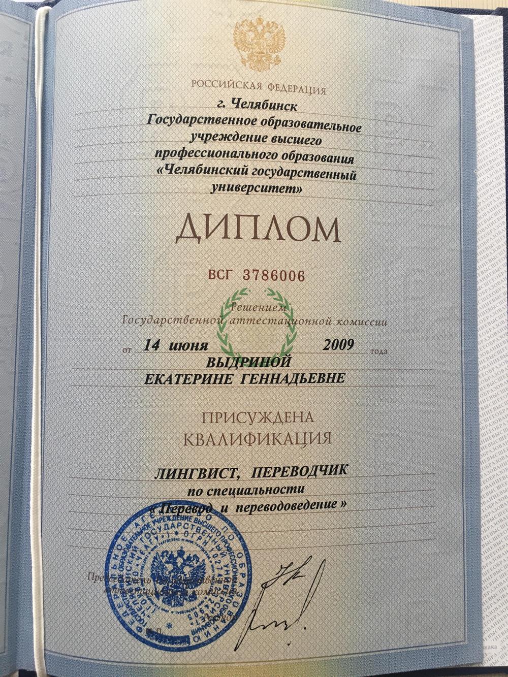 В 2009 г. я окончила Челябинский государственный университет по специальности лингвист - переводчик английского и немецкого языка и с тех пор занимаюсь преподаванием английского. Также у меня есть педагогическое образование. Репетиторская деятельность — 15 лет.• Преподавательский стаж (преподаватель английского в образовательном центре, учитель английского языка в лицее) — 10 лет.• Старший преподаватель в образовательном центре.Я за системный подход к обучению и всегда составляю индивидуальный учебный план, мои уроки проходят всегда весело и позитивно. С радостью помогу пройти сквозь дебри грамматики и лексики. Жду Вас на своих занятиях!С уважением, Е.Г. Выдрина