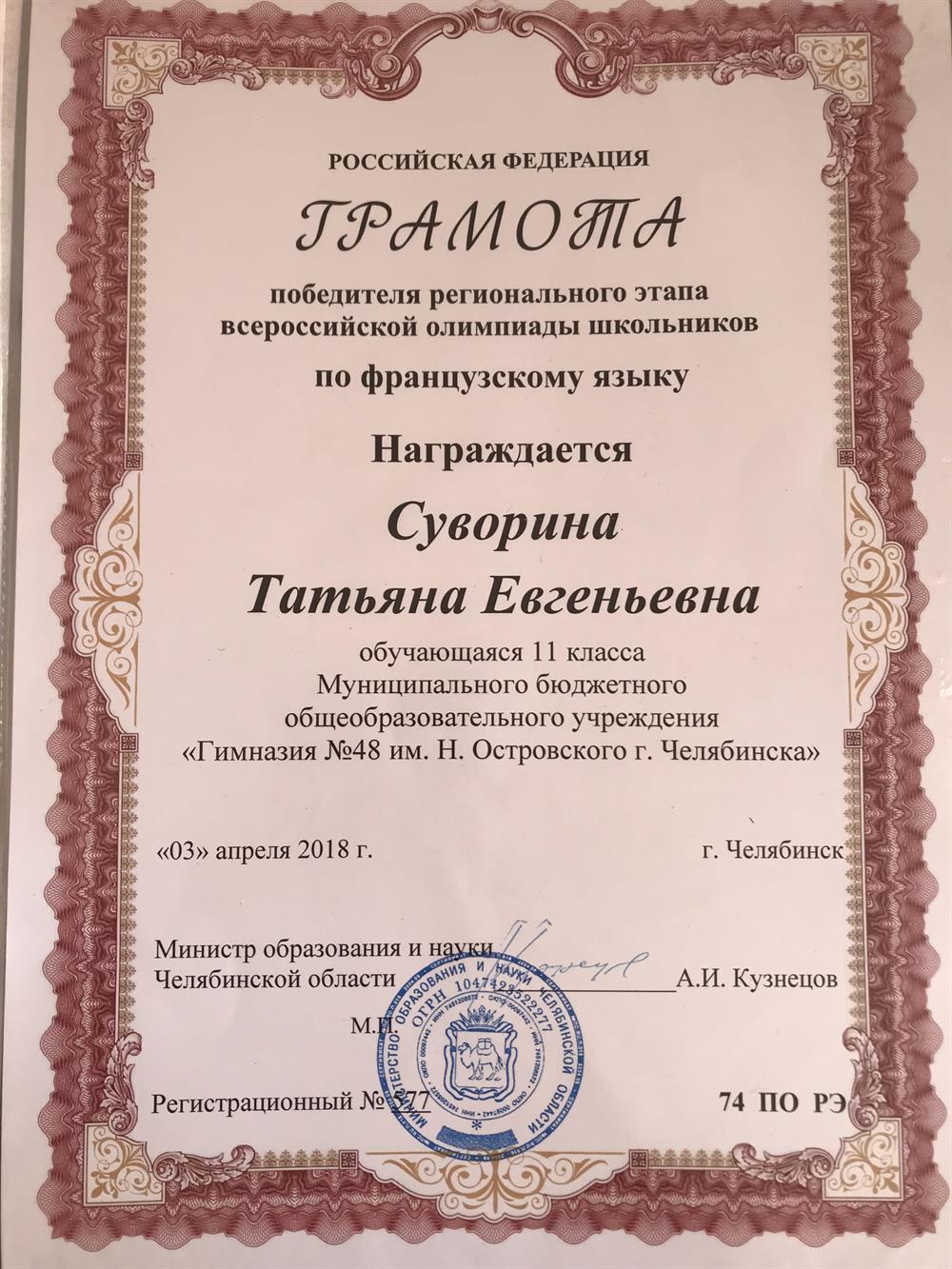 Выпускница гимназии №48 с углубленным изучением французского языка с отличными оценками и выигранными олимпиадами по профильному предмету. Студентка ЮУрГГПУ по специальности "учитель французского и английского языков".