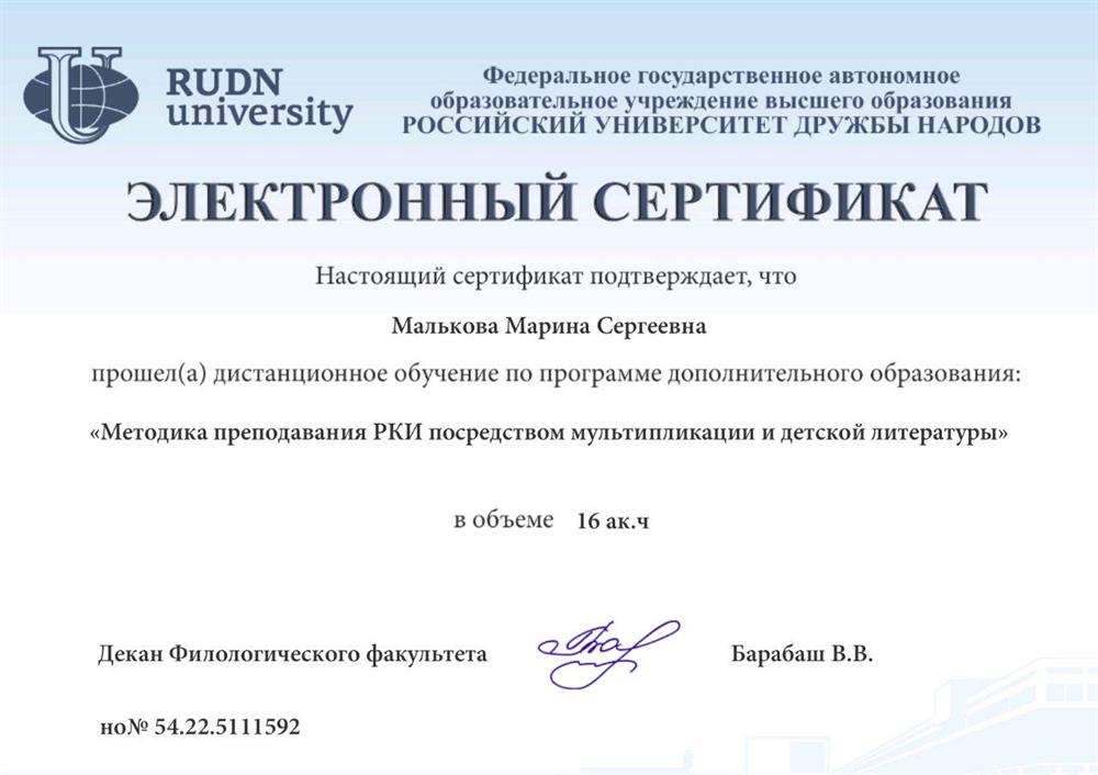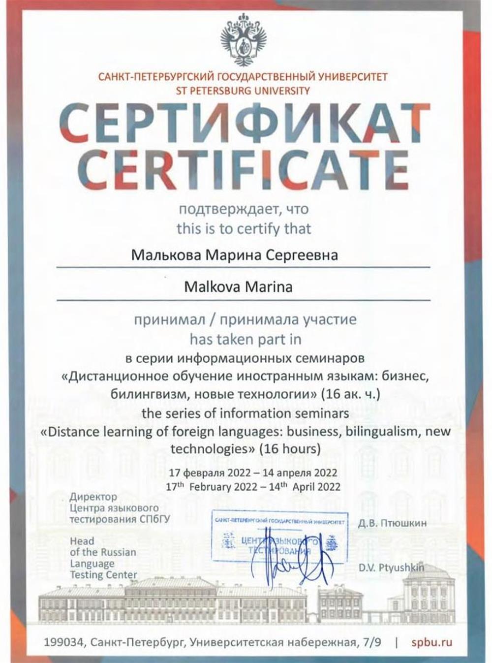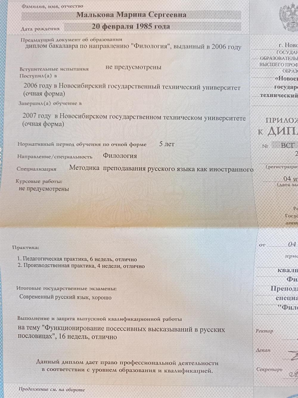Помогу Вам и Вашему ребенку полюбить русский язык, проникнуться его красотой и величием.Мои занятия дают ученику уверенность и повышают мотивацию к учебе.Индивидуальный подход к каждому ученику.Моими учениками являются представители разных национальностей и возрастов. Преподаю русский язык как иностранный (имею высшее филологическое образование со специализацией РКИ), а также русский как родной.При работе с носителями других языков применяю коммуникативный метод. На моих уроках вы будете много говорить с самого начала ( даже с уровня А1), постигать грамматику в процессе разговорной практики. Имею опыт работы с детьми ОВЗ ( ДЦП, РАС).Курсы повышения квалификации в 2021 г в НИиПКРОКурсы повышения квалификации в 2022 г в СПбГУHello. My name is Marina Malkova and I welcome you on my page Repetit.ru.I have been teaching Russian as a native language to the age group of students ranging from elementary to high school and also Russian as a foreign language.I’m specialized in Philology, specifically Russian language as a foreign one. As my students are foreigners and they are learning Russian for interaction, I mostly apply communicative approach, Use the latest studying materials and authentic books.I’m experienced in teaching various kinds of age groups what allows me to find an individual approach to every client. Teaching I take in account your personal demand and study objectives. I will be glad to cooperate with you.