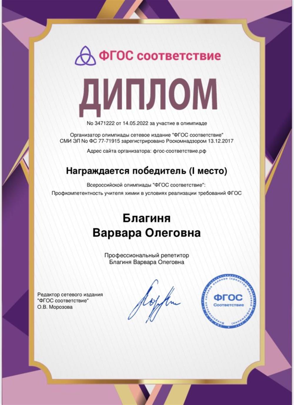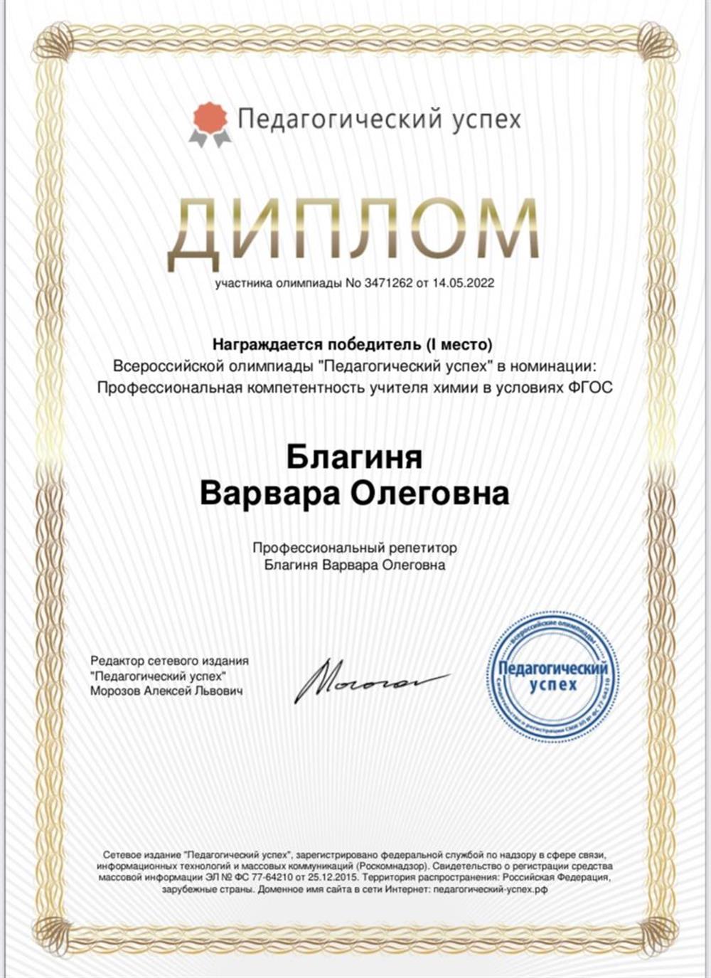Молодой специалист с опытом. Легко нахожу общий язык с детьми и подростками, за счёт чего обучение становится продуктивнее интереснее. Имею опыт успешной подготовки к ОГЭ, ЕГЭ. Лучшие результаты ЕГЭ учеников за 2022 год: 97 баллов, 91 балл, 89 баллов. Так же готовлю к экзаменам по органической и биохимии в университете. Вела кураторские занятия по органической химии в НГУ у студентов. Стаж репетиторства 4 года.Индивидуальный подход к каждому ученику. Программа обучения составляется исходя из результатов входного тестирования, которое проводится на первом занятии. При работе онлайн использую графический планшет и онлайн доску, К каждому занятию высылаю теорию по данной теме, доступ к которой у ученика остаётся навсегда. На уроках ведётся постоянный интерактив, чтобы понимать, включён ли ученик в работу и насколько он понимает тему. Трудные вещи могу объяснить доступно, «на пальцах», учу различным «запоминалкам». Регулярно провожу контроль знаний ученика и корректировку программы обучения.