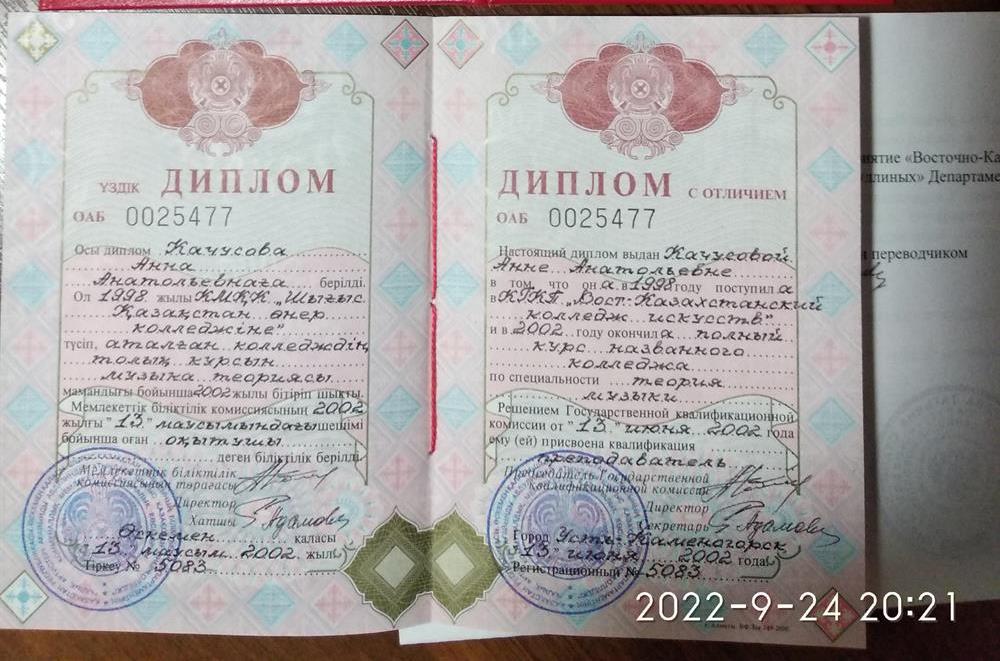 Среднее специальное образование получила в Усть-Каменогорском колледже культуры и искусств имени братьев Абдуллиных, по специальности: теория музыки.