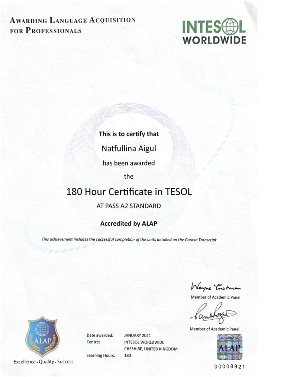 Привет! Меня зовут Айгуль.Я-сертифицированный преподаватель английского языка (TESOL) с красным дипломом преподавателя английского, а также твой личный наставник, с которым ты достигнешь цели. Мой опыт преподавания - 6 лет.Благодаря моему подходу, дружеской атмосфере на уроке и моей энергетике — мои студенты чувствуют себя раскованно, уверенно и начинают разговаривать на английском без стеснения уже на первом занятии!Я стажировалась в разных странах: США, Чешская республика, Италия.Говорю на 5 языках.