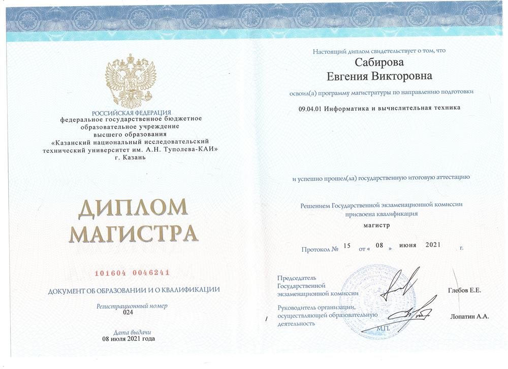 Бакалавр по специальности 09.03.01 Информатика и вычислительная техника, 2015-2019 гг. Магистр по по специальности 09.04.01 Информатика и вычислительная техника, 2019-2021 гг.