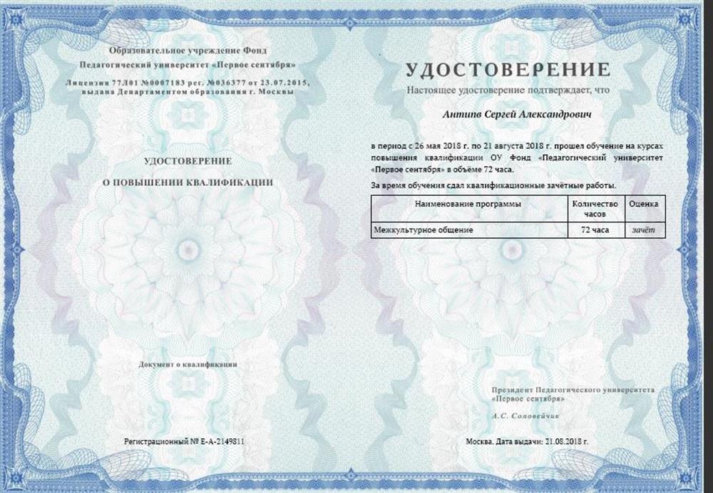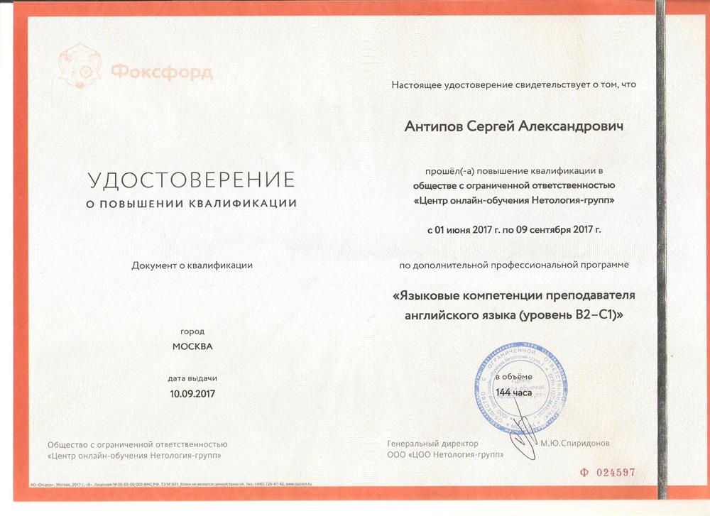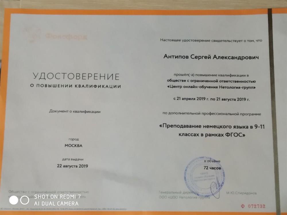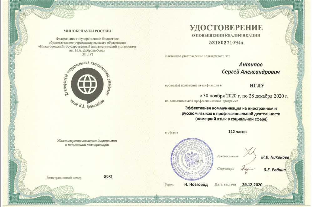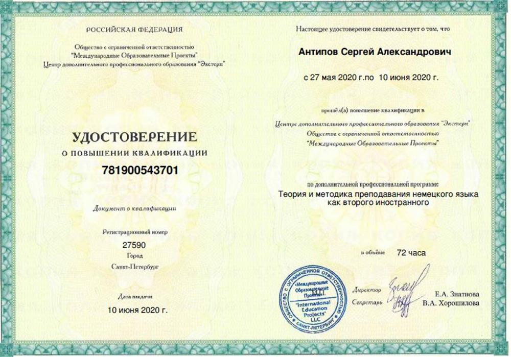 Повышение квалификации:Английский язык:Международный сертификат по английскому языку продвинутого уровня (Certificate in Аdvanced English С1), 2019 г.Удостоверение о повышении квалификации онлайн-школы иностранных языков «Фоксфорд»: «Языковые компетенции преподавателя» (уровень B2-C1) (2017 г.).МГУ им. Ломоносова, дополнительная образовательная программа «Язык, культура и межкультурная коммуникация», 36 часов (2016 г.).Coursera, Shaping the Way We Teach English Part I, The University of Oregon («Формирование подходов в преподавании английского языка», часть I, Орегонский университет): the Landscape of English Language Teaching (2015 г.).Coursera, Shaping the Way We Teach English Part II, The University of Oregon («Формирование подходов в преподавании английского языка», часть II, Орегонский университет): Paths to Success in ELT (2016 г.).Coursera, The Miracles of Human Language: An Introduction to Linguistics («Чудеса человеческого языка. Введение в лингвистику») (2015 г.).Онлайн-школа иностранных языков «Фоксфорд»: «Методические аспекты преподавания иностранного языка» (в русле системно-деятельностного подхода) 72 часа (2016 г.).Немецкий язык:Удостоверение о повышении квалификации ПУ "Первое сентября" "Развитие грамматической компетенции с помощью системы упражнений", 72 часа, 2019 г.