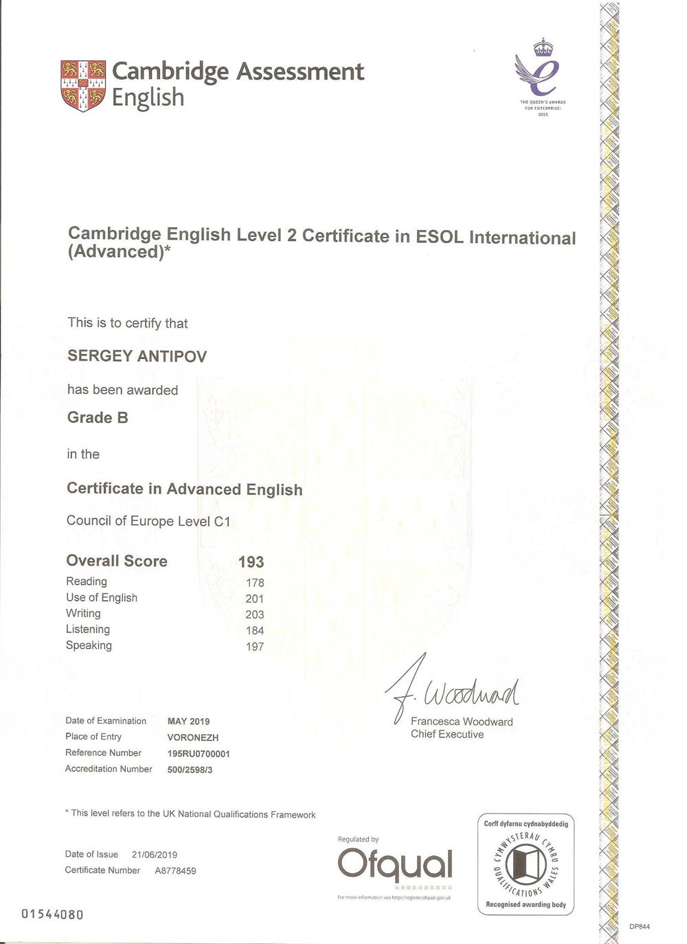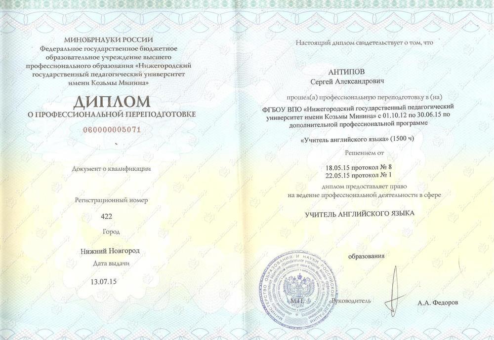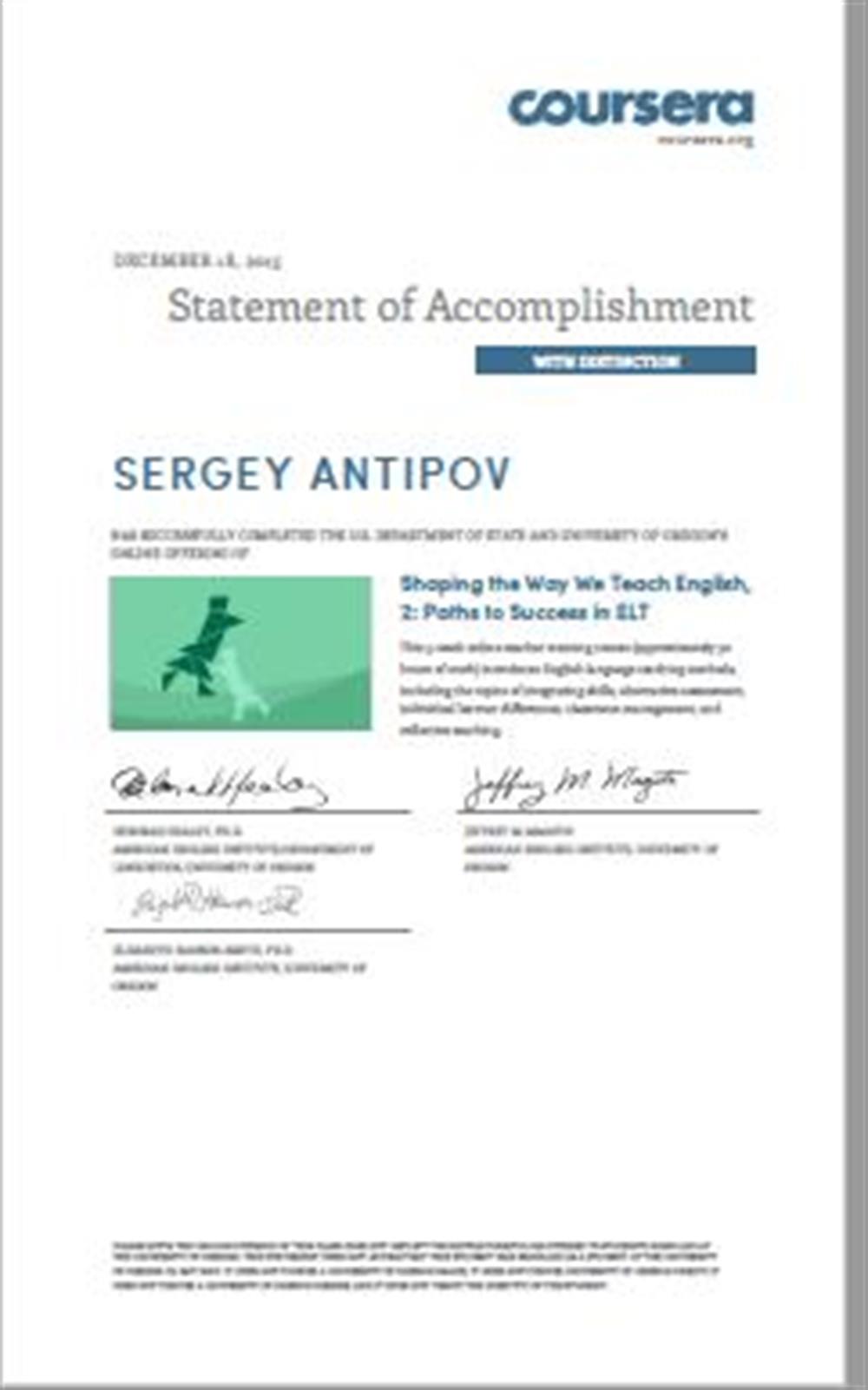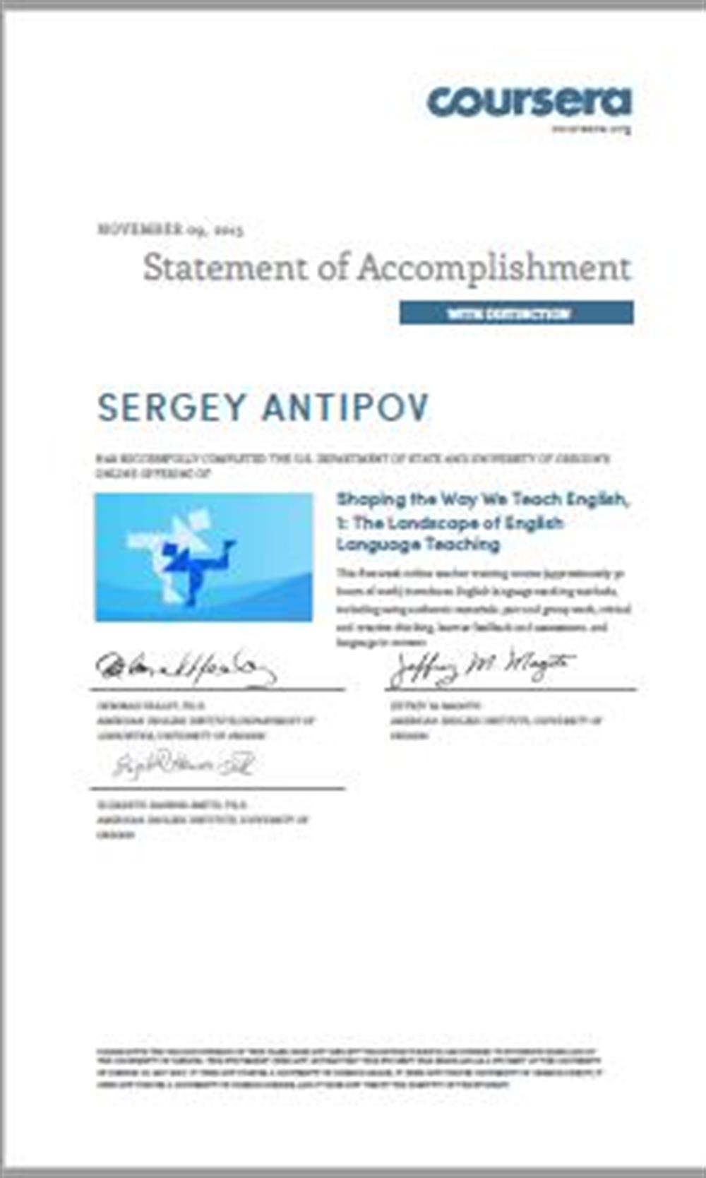 Повышение квалификации:Английский язык:Международный сертификат по английскому языку продвинутого уровня (Certificate in Аdvanced English С1), 2019 г.Удостоверение о повышении квалификации онлайн-школы иностранных языков «Фоксфорд»: «Языковые компетенции преподавателя» (уровень B2-C1) (2017 г.).МГУ им. Ломоносова, дополнительная образовательная программа «Язык, культура и межкультурная коммуникация», 36 часов (2016 г.).Coursera, Shaping the Way We Teach English Part I, The University of Oregon («Формирование подходов в преподавании английского языка», часть I, Орегонский университет): the Landscape of English Language Teaching (2015 г.).Coursera, Shaping the Way We Teach English Part II, The University of Oregon («Формирование подходов в преподавании английского языка», часть II, Орегонский университет): Paths to Success in ELT (2016 г.).Coursera, The Miracles of Human Language: An Introduction to Linguistics («Чудеса человеческого языка. Введение в лингвистику») (2015 г.).Онлайн-школа иностранных языков «Фоксфорд»: «Методические аспекты преподавания иностранного языка» (в русле системно-деятельностного подхода) 72 часа (2016 г.).Немецкий язык:Удостоверение о повышении квалификации ПУ "Первое сентября" "Развитие грамматической компетенции с помощью системы упражнений", 72 часа, 2019 г.