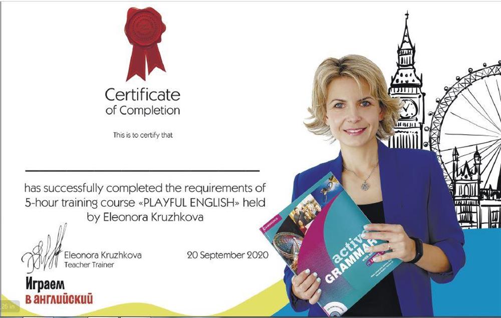 Кроме изучения английского в университете, проходила курсы "English as a second language" в 2017 году. Стараюсь регулярно поддерживать свой уровень владения языком и совершенствовать знания, слежу за изменениями, прохожу вебинары. Есть опыт проведения групповых занятий.