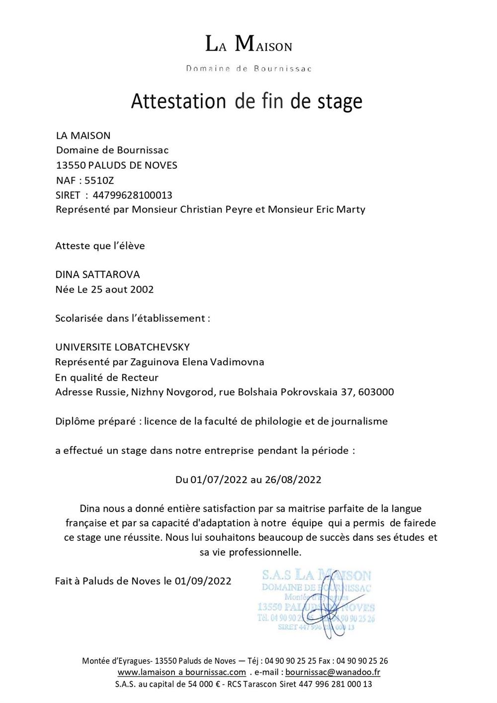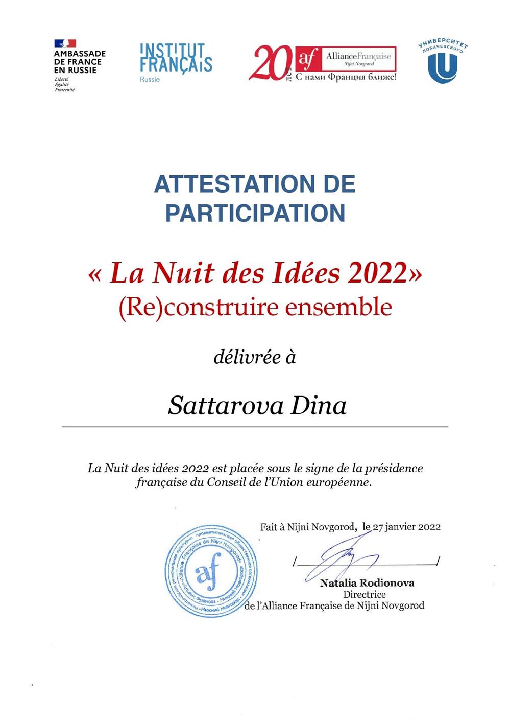 Прошла профессиональную стажировку во Франции в течение лета 2022 года. Изучение французского языка в университете как основного языка. Участие в Международном проекте при поддержке посольства Франции "La nuit des idees" (Re)construire ensemble 2022.