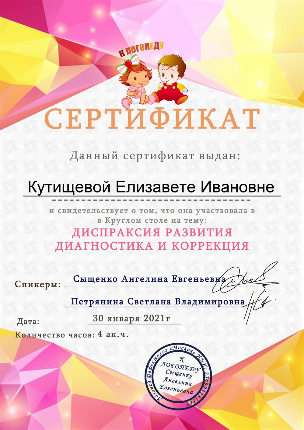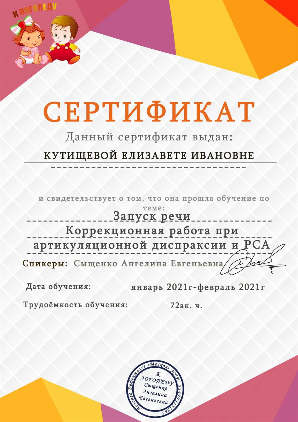 Со слов клиента: "Хороший репетитор, позанималась с ребенком, все объяснила. Умница, молодая, но опытная, дала мне советы. Быстро нашла подход к ребенку. Было 1 занятие, мы решили дальше сами заниматься, теперь ребенок сам хорошо разговаривает".