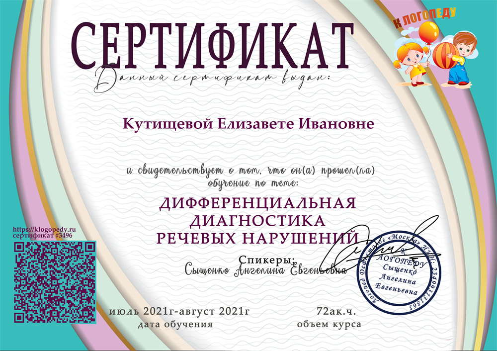 Консультация логопеда (с 2,5 лет).Работаю с безречевыми детьми с 2.9 - 3 лет.Коррекция речевых нарушений (ОНР, ЗРР, ЗПРР, ФФН, диспраксия, РСА, дизартрия, дислалия, дислексия, дисграфия, алалия (дисфазия)).Развитие высших психических функций (внимание, память, мышление).Подготовка к школе детей с 4-х лет:Формирование учебного поведенияЧтениеПисьмоМатематикаПолная диагностика состояния речевой функции (лексический запас, сформированность грамматических категорий, слоговая структура, фонематические процессы, звукопроизношение)Развитие речи (лексика, грамматика)Развитие фонематических процессовРазвитие высших психических функцийПостановка отсутствующих звуковМелкая и артикуляционная моторикаРечевое дыхание