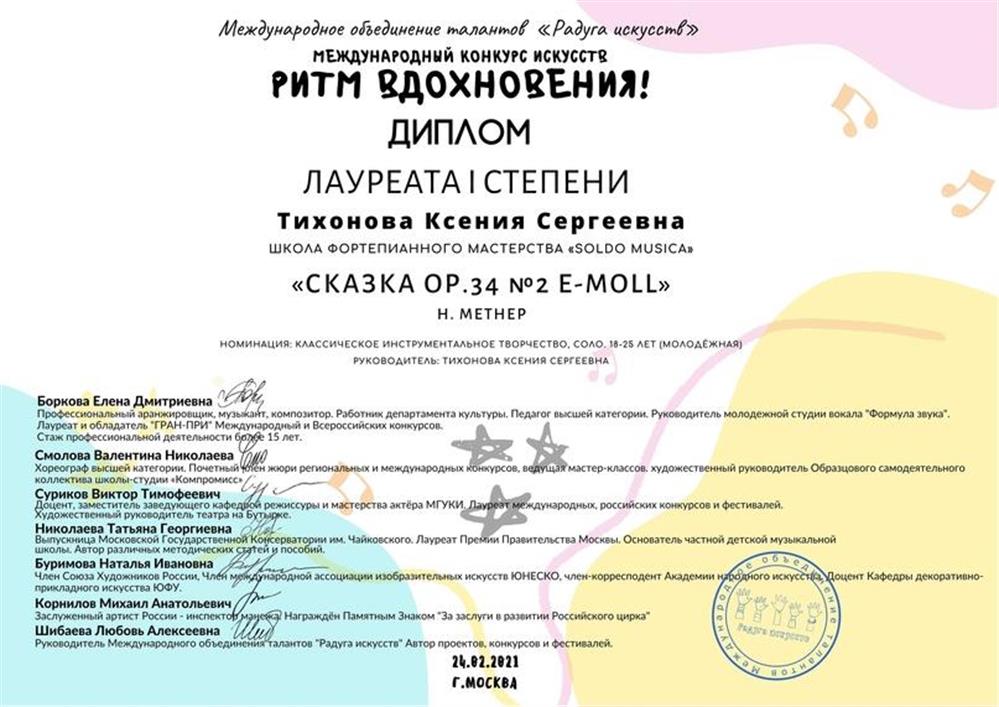 Меня зовут Ксения Тихонова.Я преподаю предмет Фортепиано деткам и взрослым, а ещё являюсь Членом Российского музыкального союза.Со мной вы с первого же урока сможете сыграть первую песенку самостоятельно;Пройти путь от игры в классе до игры на сцене;Подготовиться к поступлению в музыкальную школу/ к конкурсу с гарантией самого высокого балла;Результаты моих учеников вдохновляют:7 учеников получили звания Лауреатов международных конкурсов и олимпиад, в копилке наших побед уже 10 дипломов.2 ученика поступили с самыми высокими баллами в музыкальные школы Нижнего Новгорода и Санкт-Петербурга.О себе:7 лет опыта в репетиторстве.Более 60 довольных учеников с живыми отзывами.Являюсь 4-кратным Лауреат международных конкурсов.Обладатель 3-х дипломов о музыкальном образовании, 2 с отличием.Автор 1-й написанной книги для родителей, не обладающих знаниями нотной грамоты, как помощь в обучении игры малышам от 3-х до 5-ти лет.Детки занимаются по моей авторской программе, куда входят такие виды деятельности, как Рисование, Активные игры и, конечно же, Игра на инструменте. К представленной программе обучения прилагается моё авторское пособие по Элементарной теории музыки.Стоимость занятий:Индивидуальное занятие и онлайн-занятие(60 мин.) - 1000р.Выезд на дом(60 мин.) - 1500р.Запишитесь на БЕСПЛАТНОЕ пробное занятие!