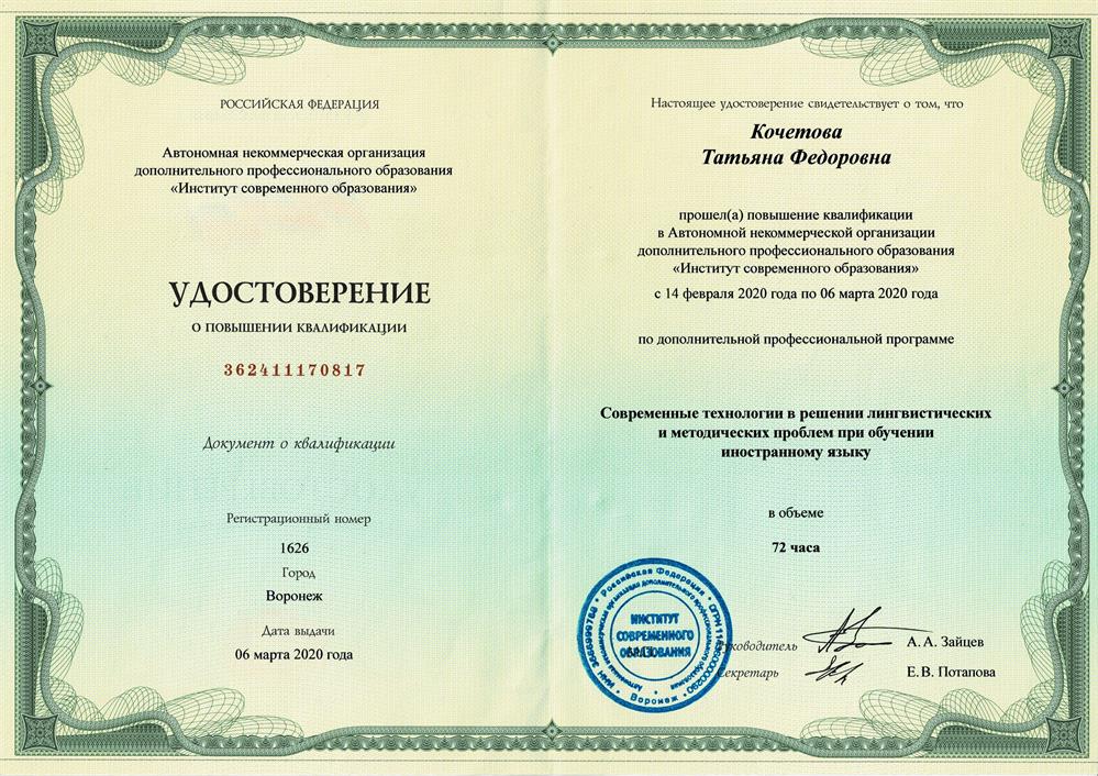 Добрый день! Меня зовут Татьяна Фёдоровна Кочетова. Предлагаю интересные уроки английского и немецкого языков. Более 20 лет опыта преподавания в частных школах, колледжах и университетах, а также на частной основе: разговорный курс, грамматический интенсив, бизнес курс, тематический английский (IT технологии, медицина, юриспруденция, авиация и др), подготовка к ОГЭ, ЕГЭ, международным экзаменам (IELTS, TOEFL, FCE, BEC, BULATS, GMAT, TOEIC, PTE, etc). Применяю современные технологии и последние методические материалы. Ученики сдают ОГЭ, ЕГЭ, международные экзамены на высшие баллы. Постоянно повышаю уровень, выступая в качестве переводчика и общаясь с носителями. Знакома с виртуальными платформами обучения Wimbox, Zoom, Google Classroom, Microsoft Teams, умею преподнести материал в интересной и понятной форме.